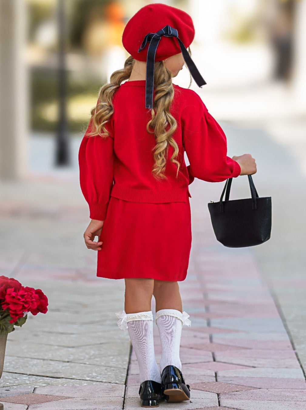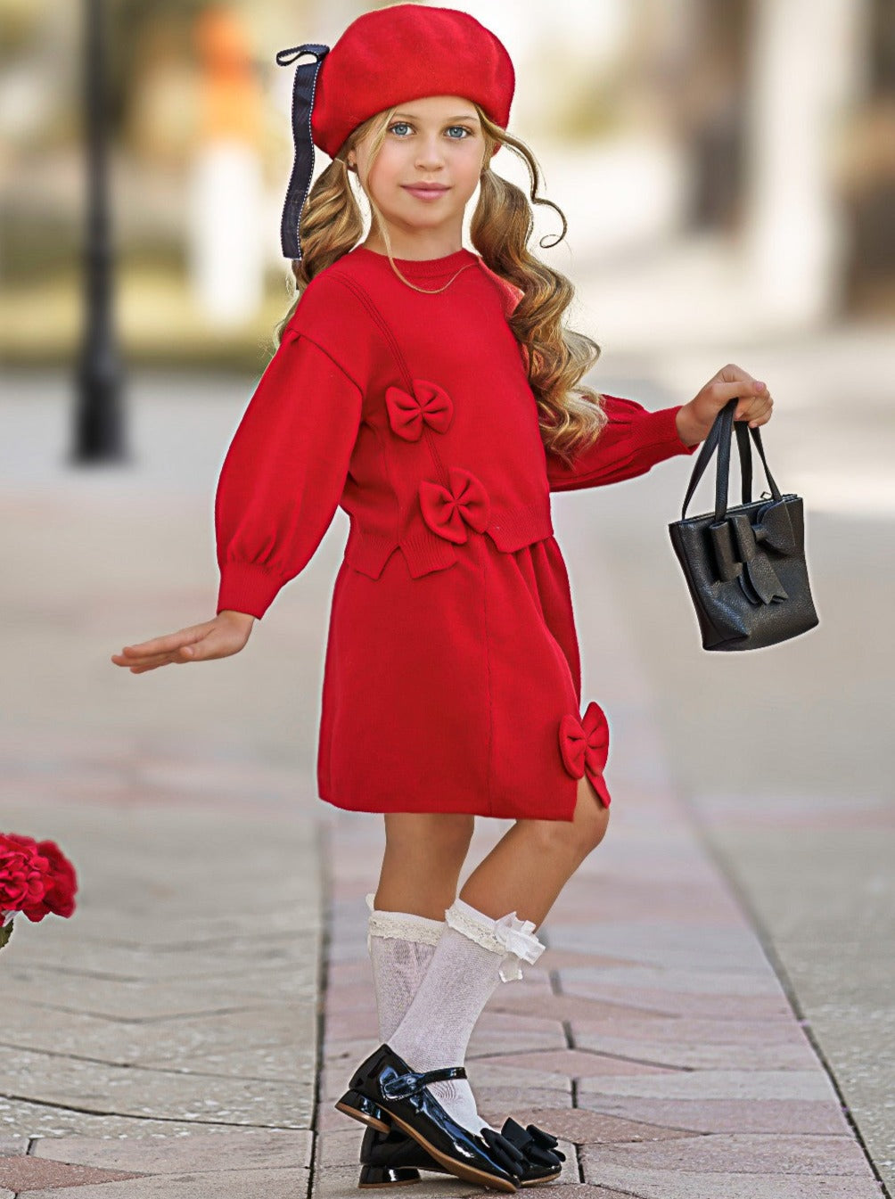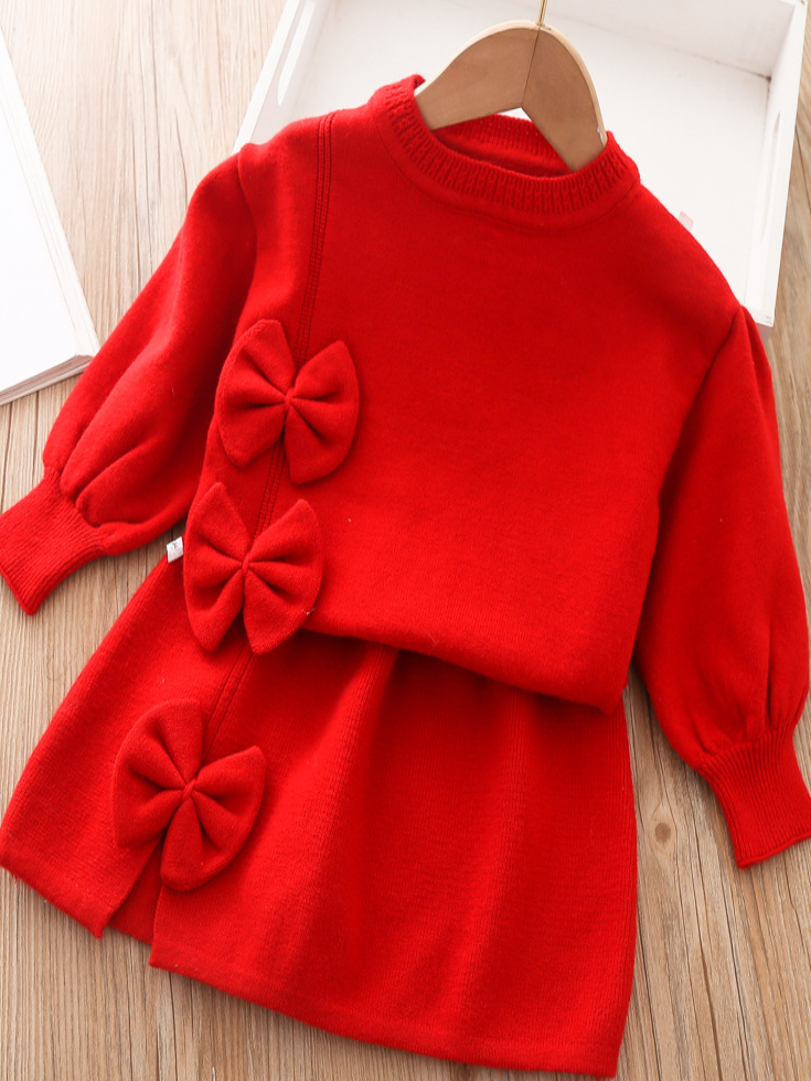 - Long-sleeve sweater with bowknot applique and matching skirt