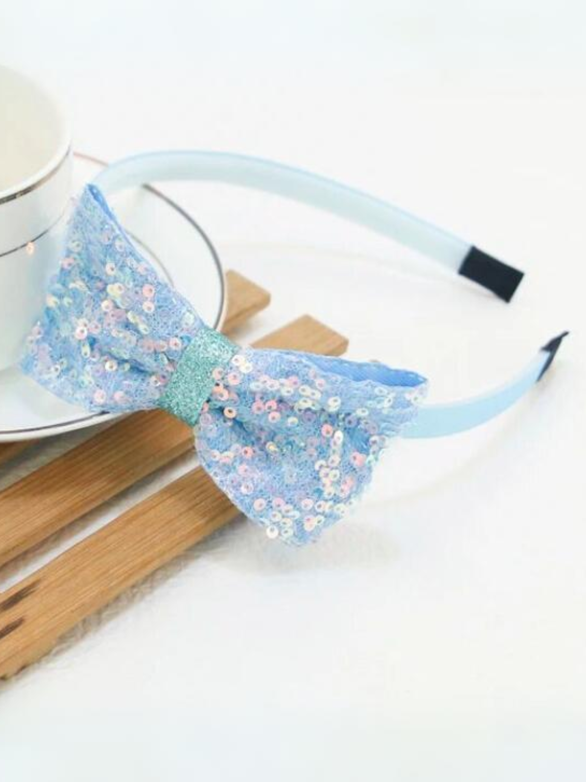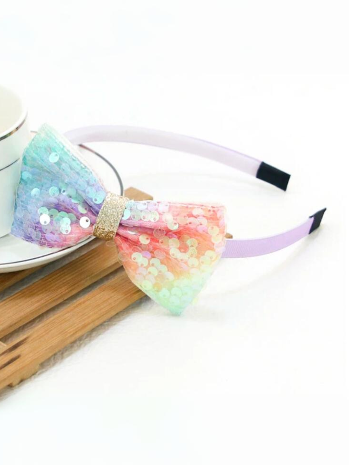 - Thin headband with assorted sequin bow accent