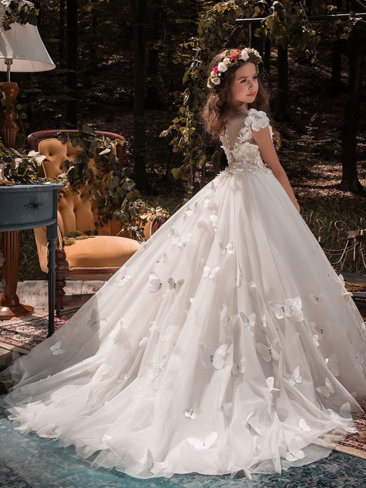 - The most enchanted dress ever! Our butterfly-embellished tulle gown has a gorgeous long silhouette decorated with the dreamiest details. With florals on the bodice and butterflies on the skirt, this piece is THE ONE for your little princess!