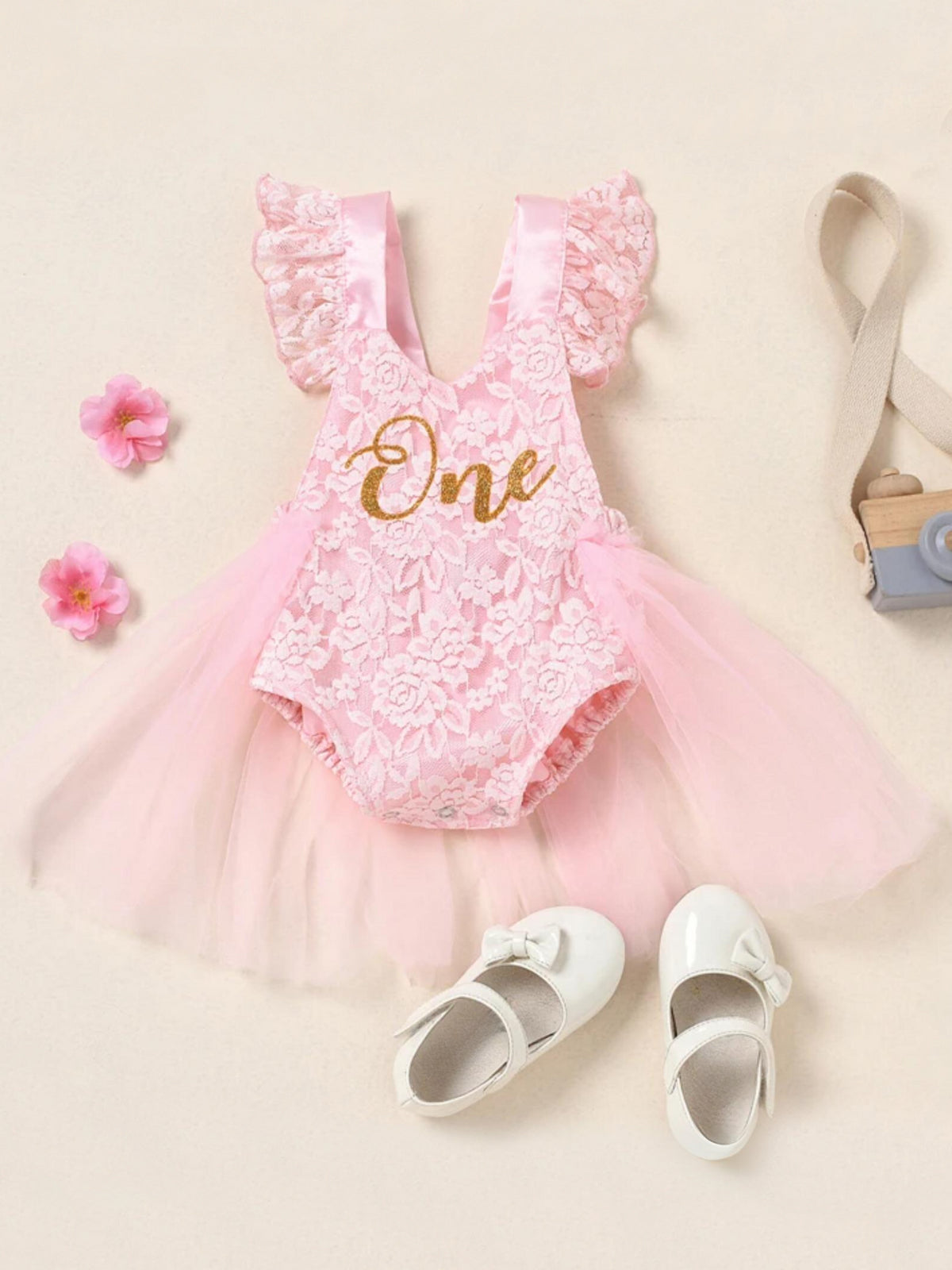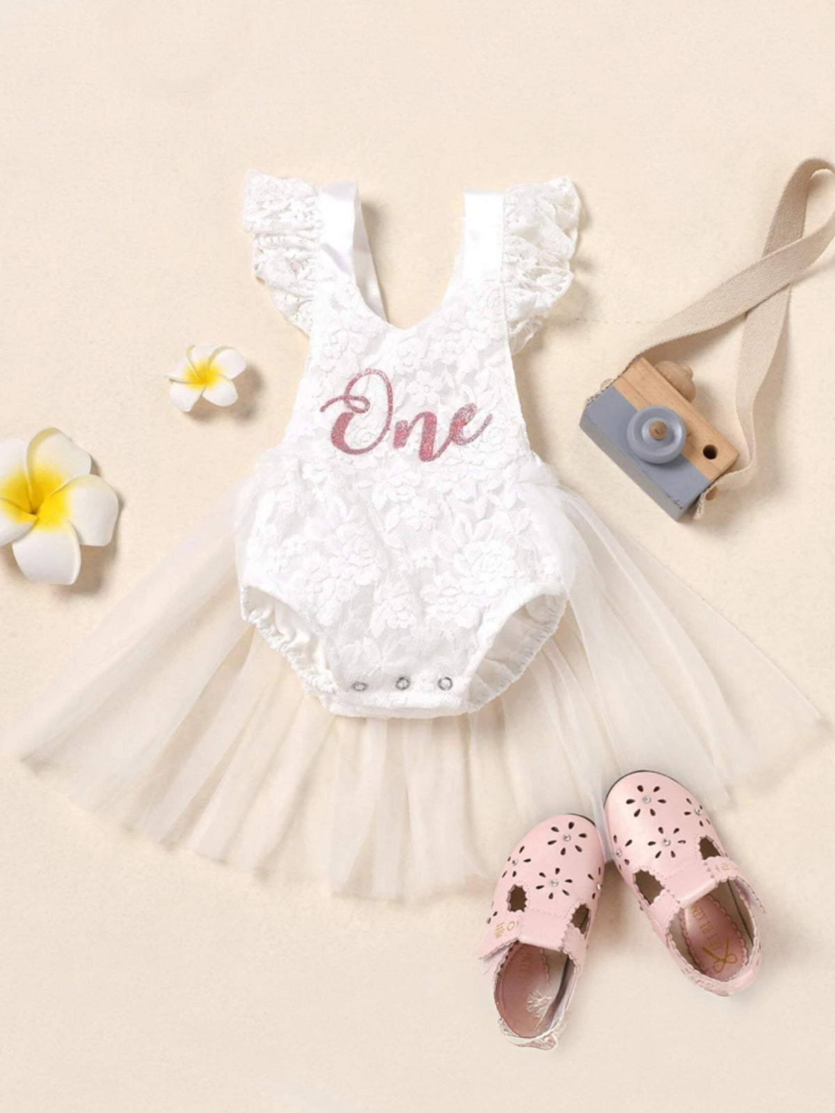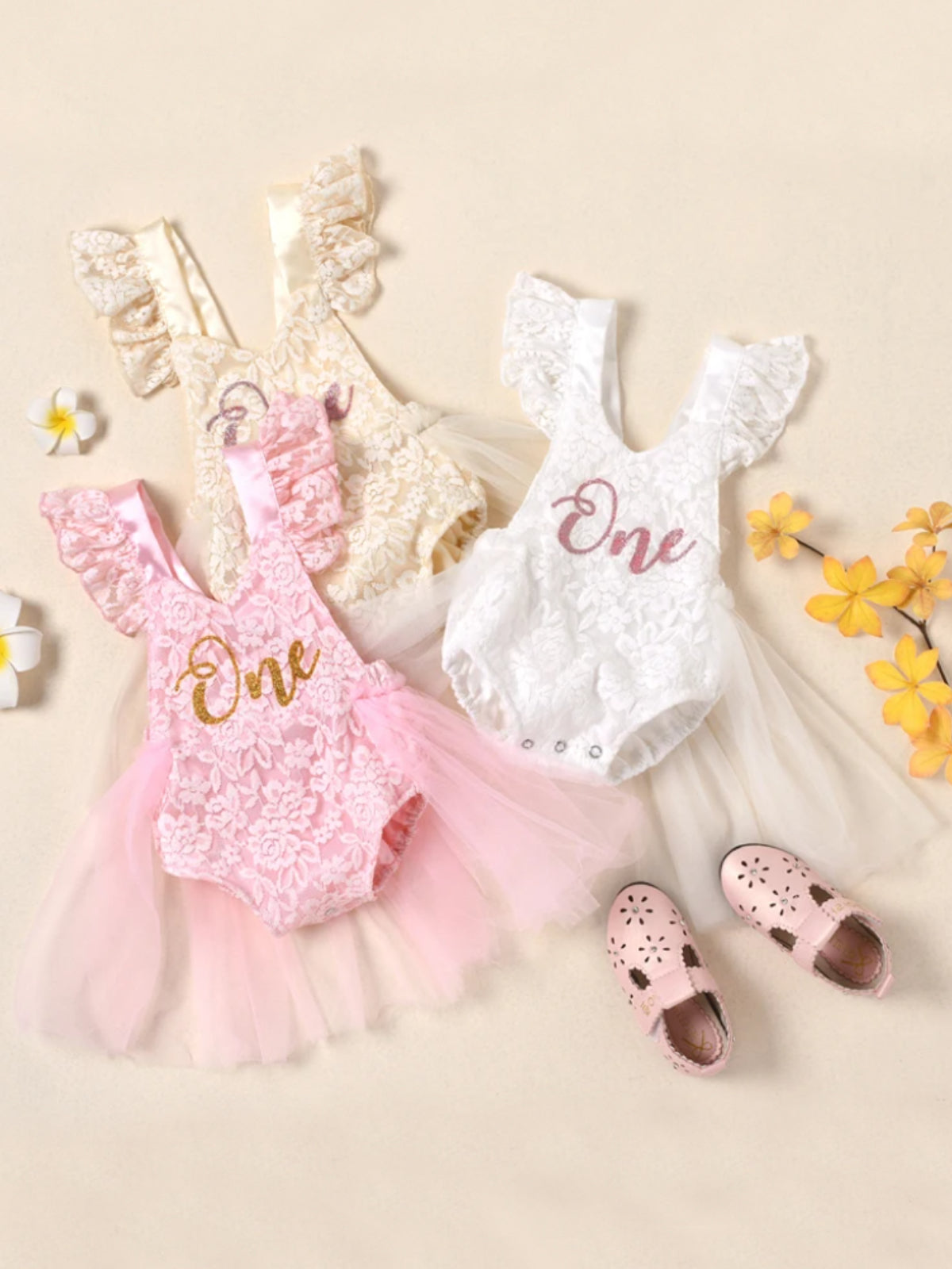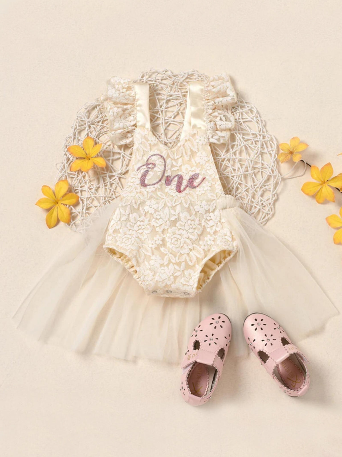 - Adorned with intricate lace and a delicately embroidered "One" to celebrate her first year, this outfit is perfect for birthday celebrations or as a lovely gift.