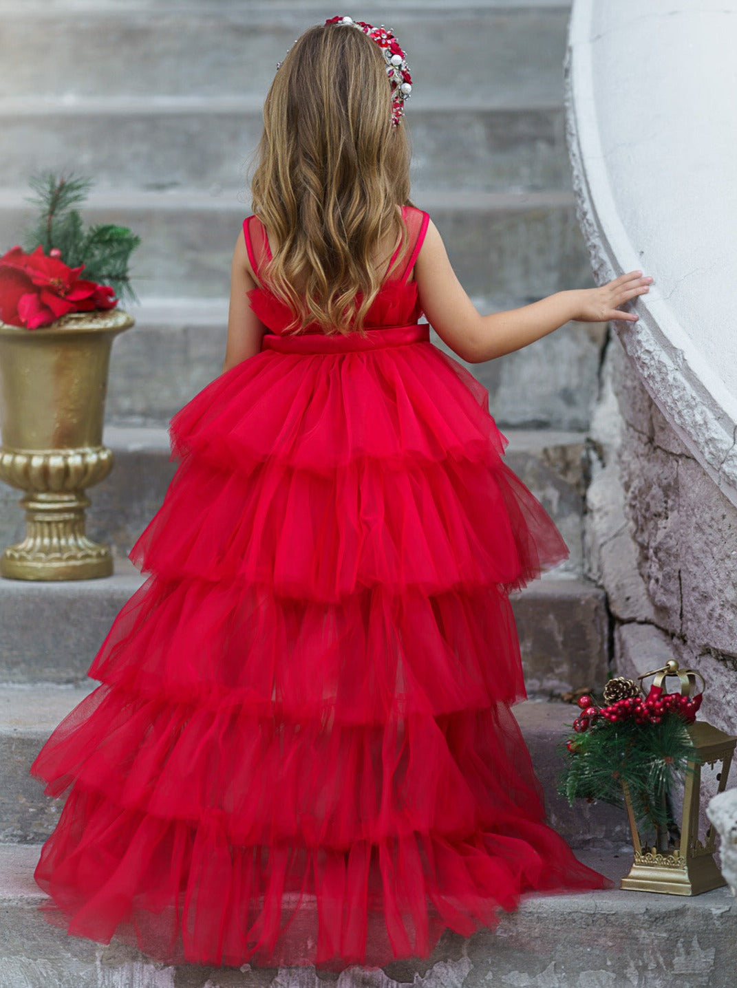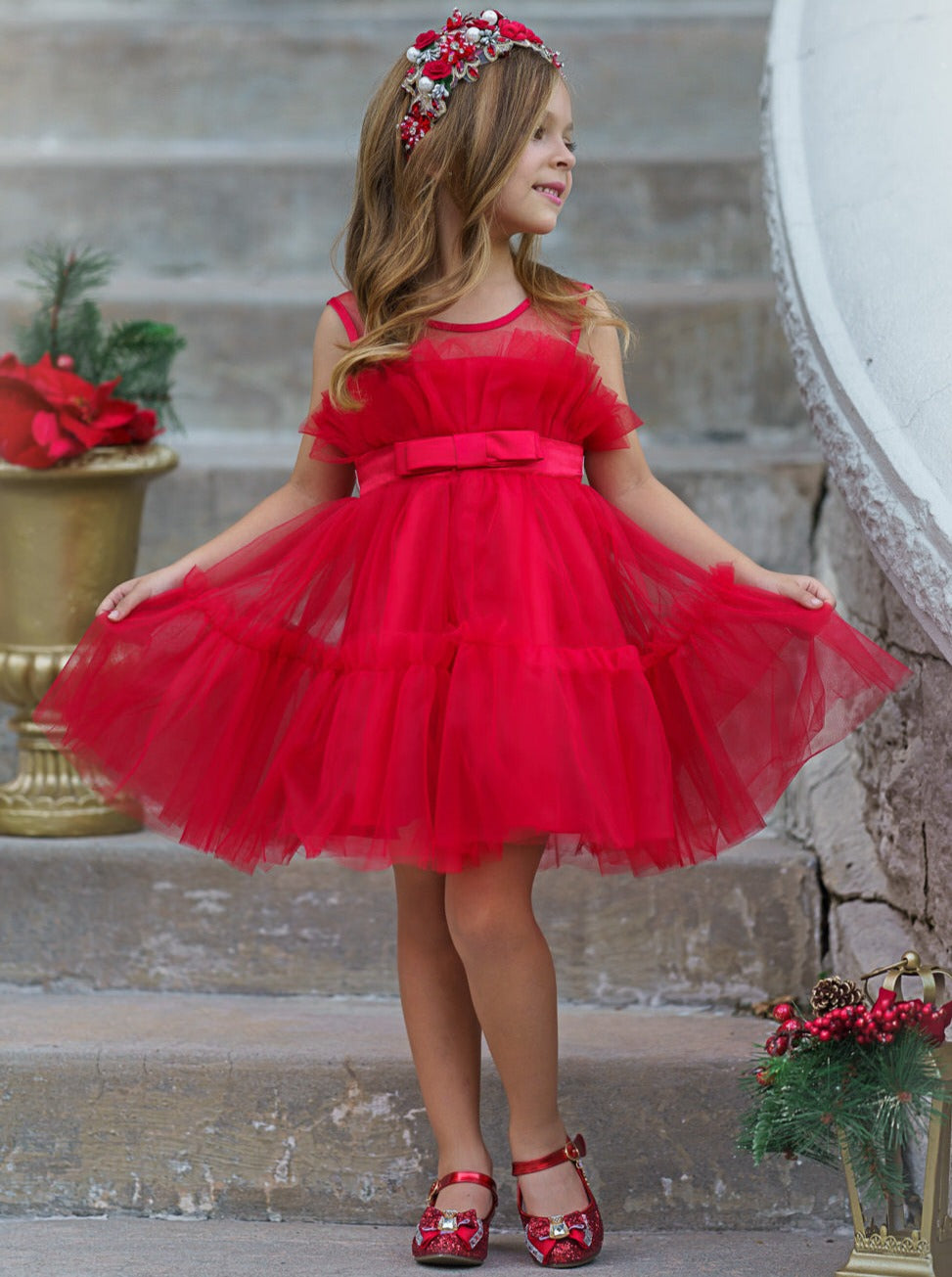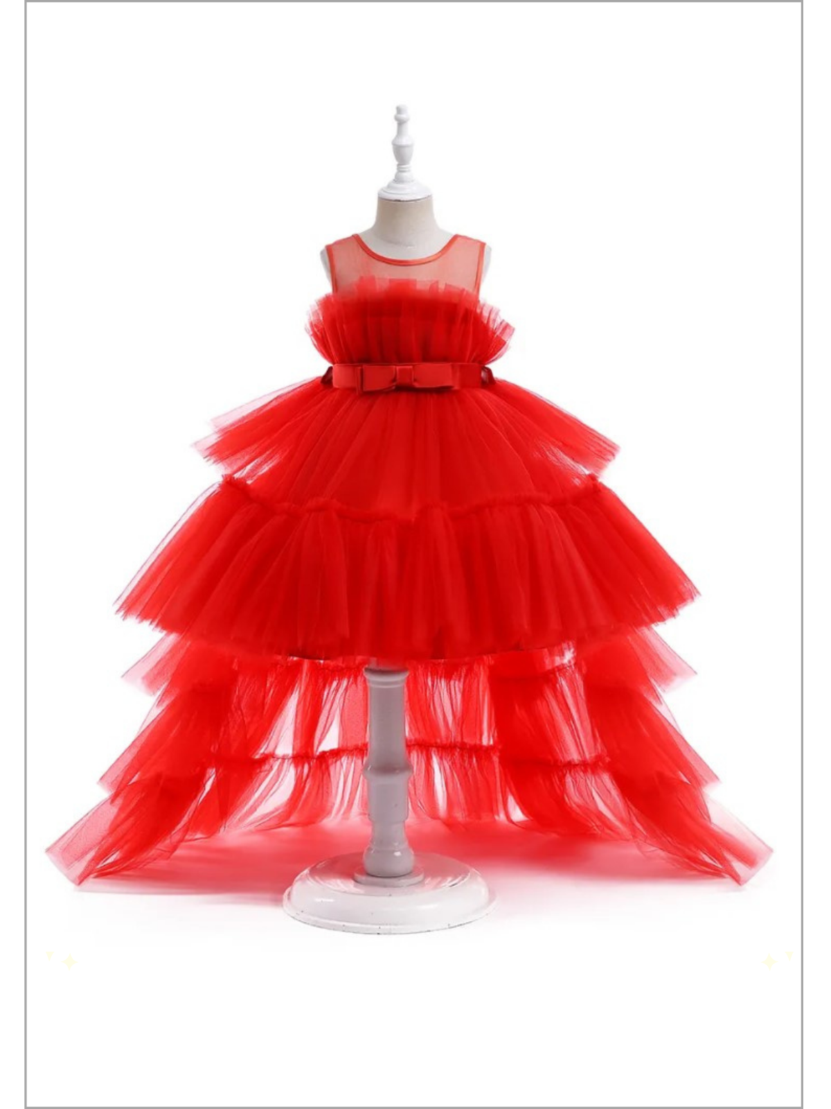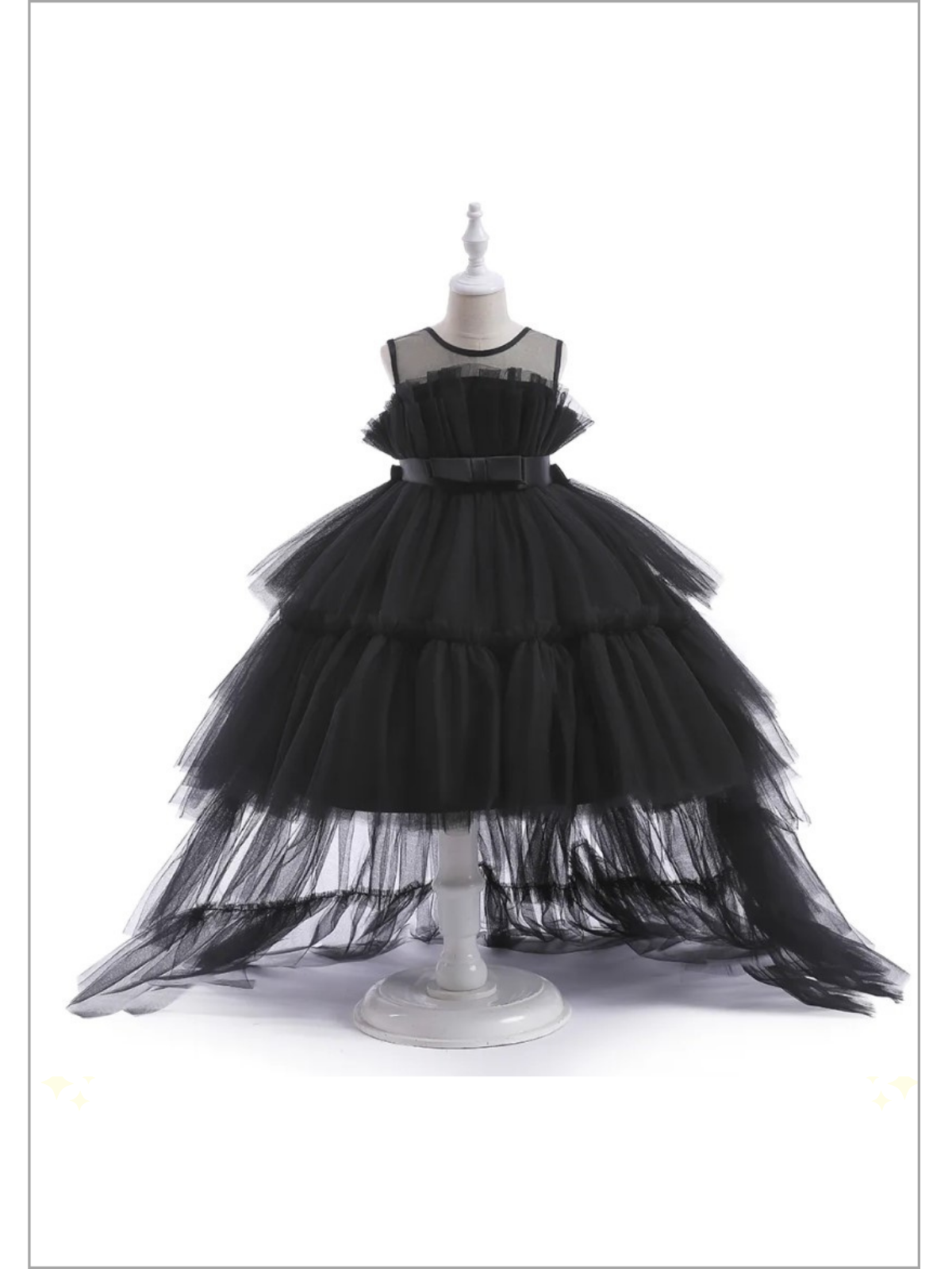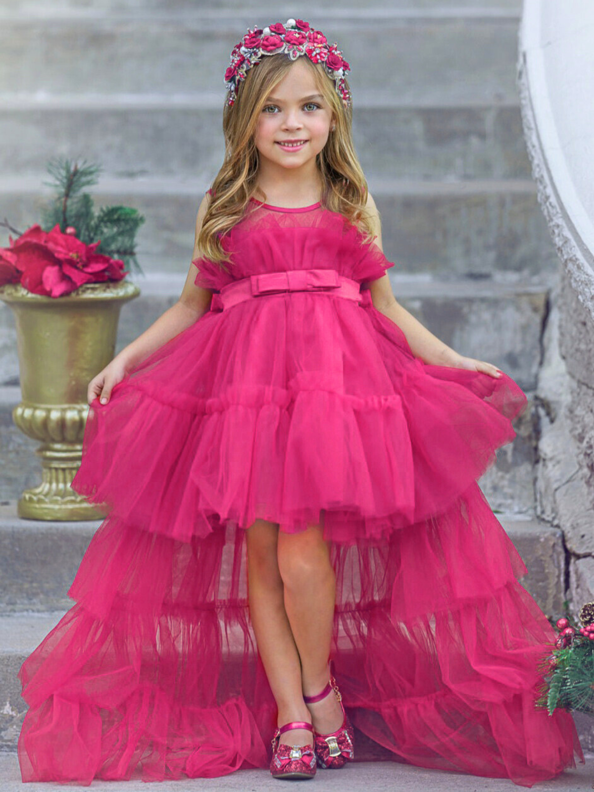 - Frills for days! Our trailing tulle gown boasts a stunning design with its gathered bodice and voluminous silhouette. Finished with a satin bow waistband for an added touch of sophistication. A princess-worthy style your little one will love!