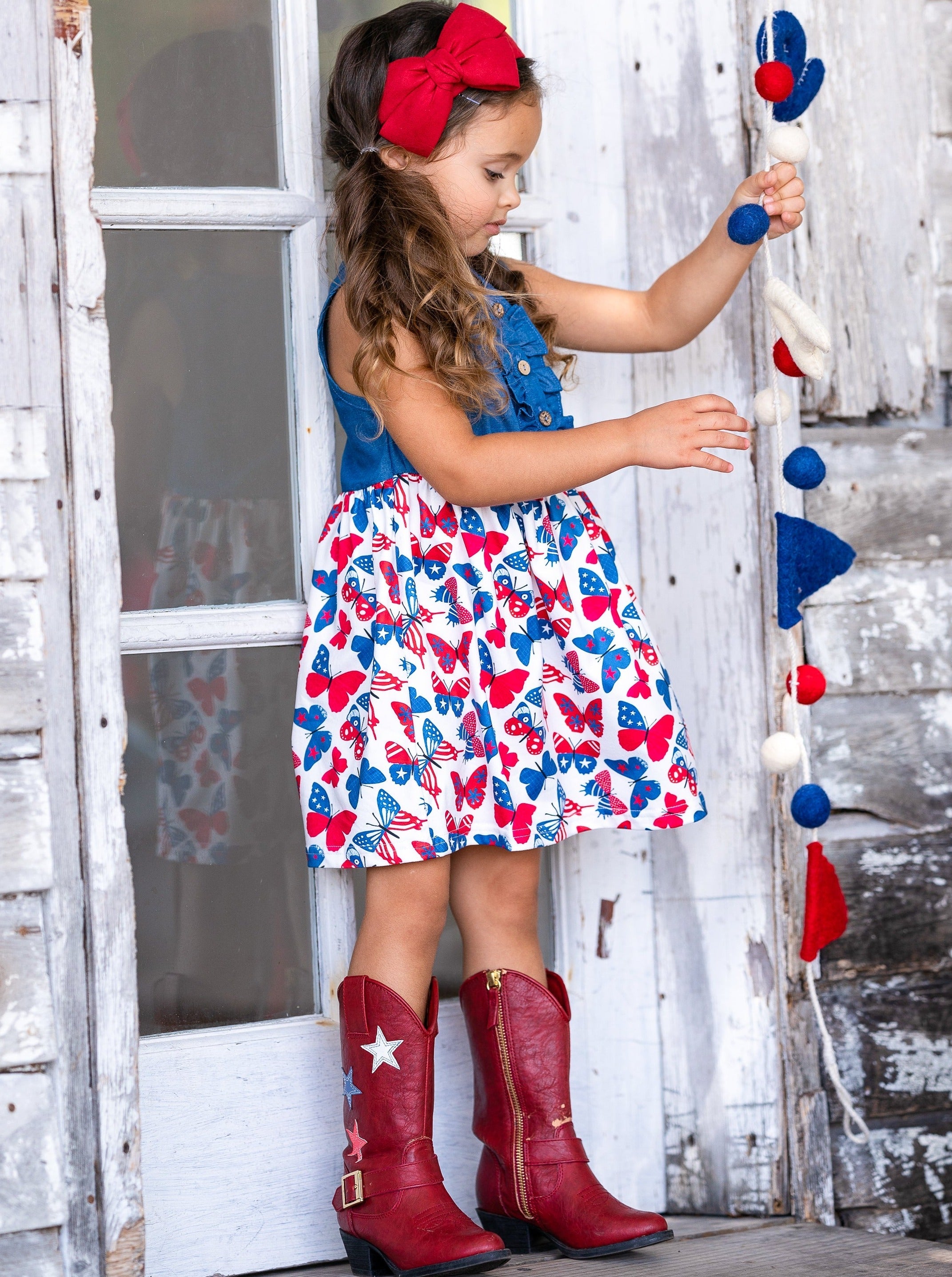 - Simple but oh-so-cute, this patriotic chambray butterfly sundress will help your little girl's confidence take flight. Vibrant reds and blues of winged beauties are printed on the skirt for a touch of magic. She'll be the cutest Americana in the room!