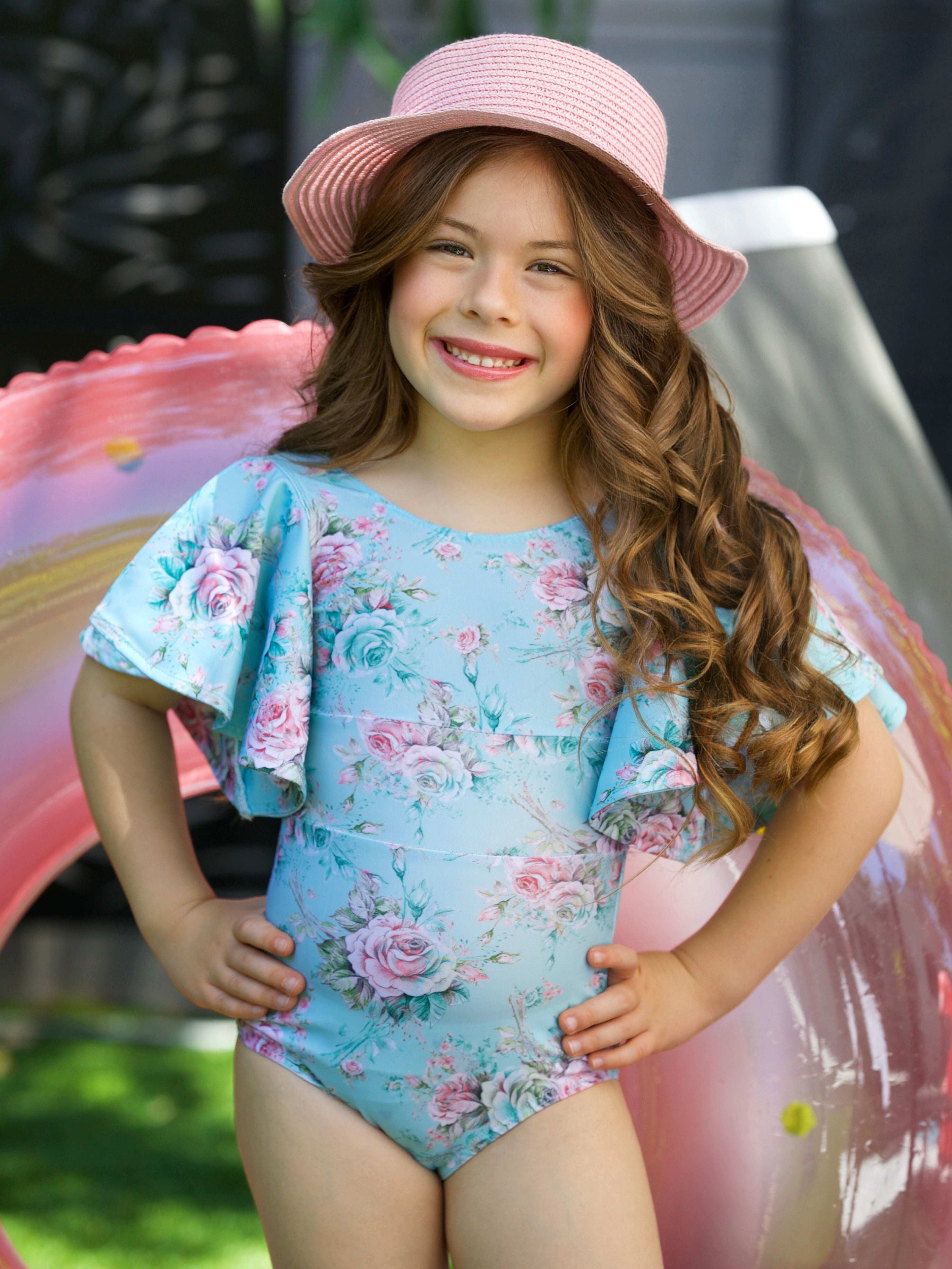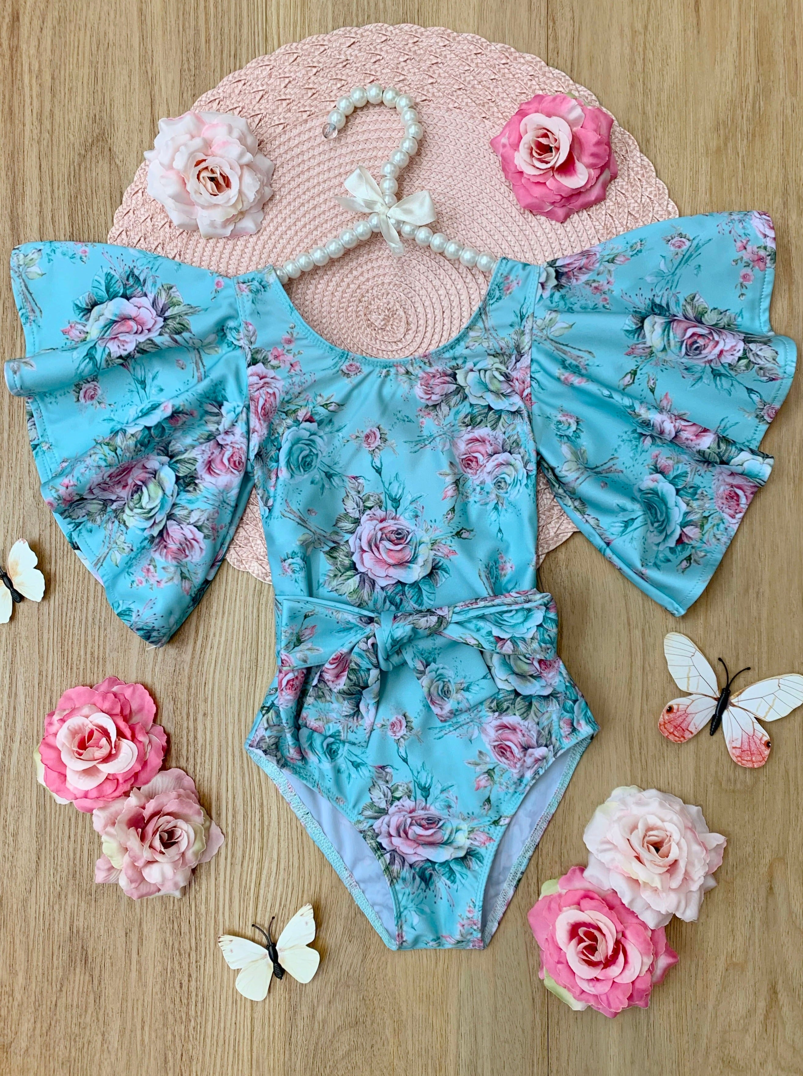 - Seas the day with a tail-ored flare sleeve one-piece swimsuit. The pink and blue rose petals look darling with the flexible mint material that won't bunch or sag. The flattering waist tie gives accenting options for a look all her own.