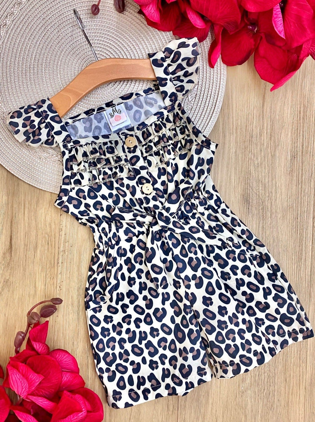 - Flutter shoulder romper with ruffle accents, button-down bodice, a built-in sash at the waist, and pockets