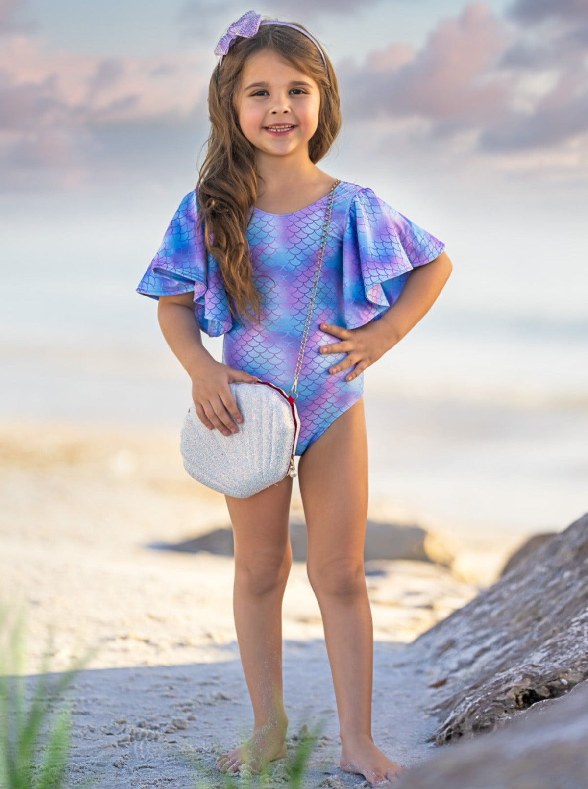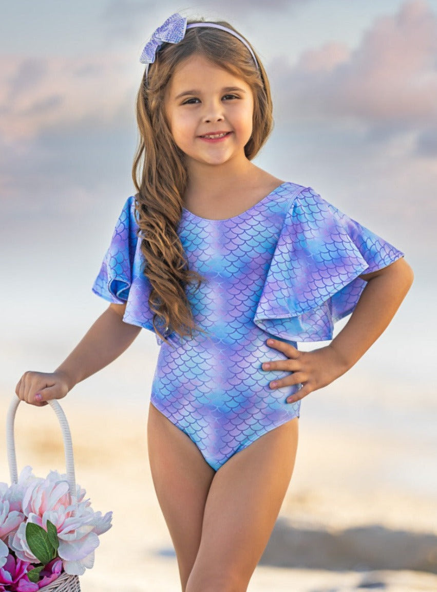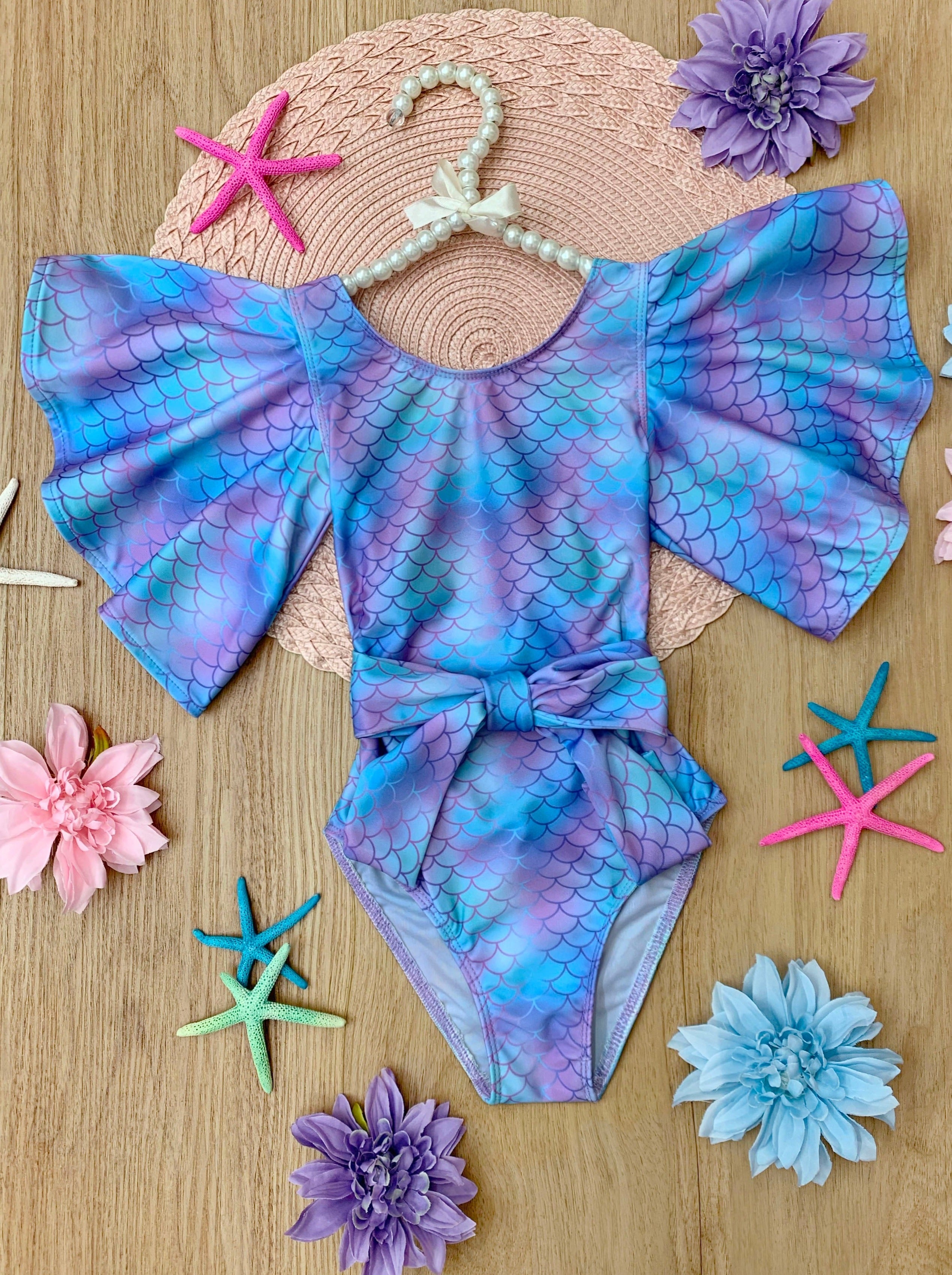 - Ocean vibes and high tides call for our fin-tastic flare sleeve one-piece swimsuit. The vibrant purple and blue mermaid scales will have your sweet swimmer slaying the 7 seas with a fashionable flair. And the adjustable waist tie creates an even cuter shape for your mini!