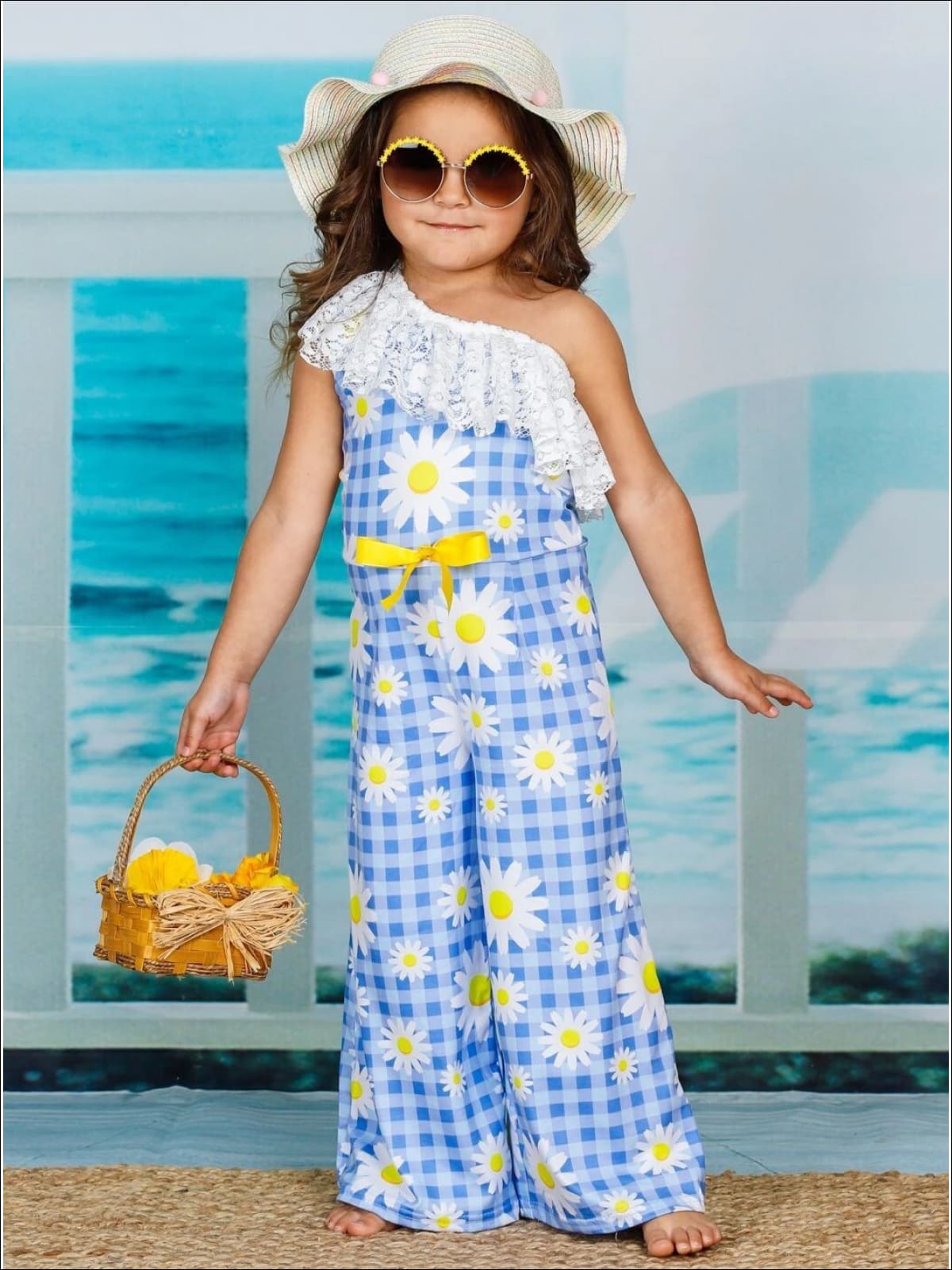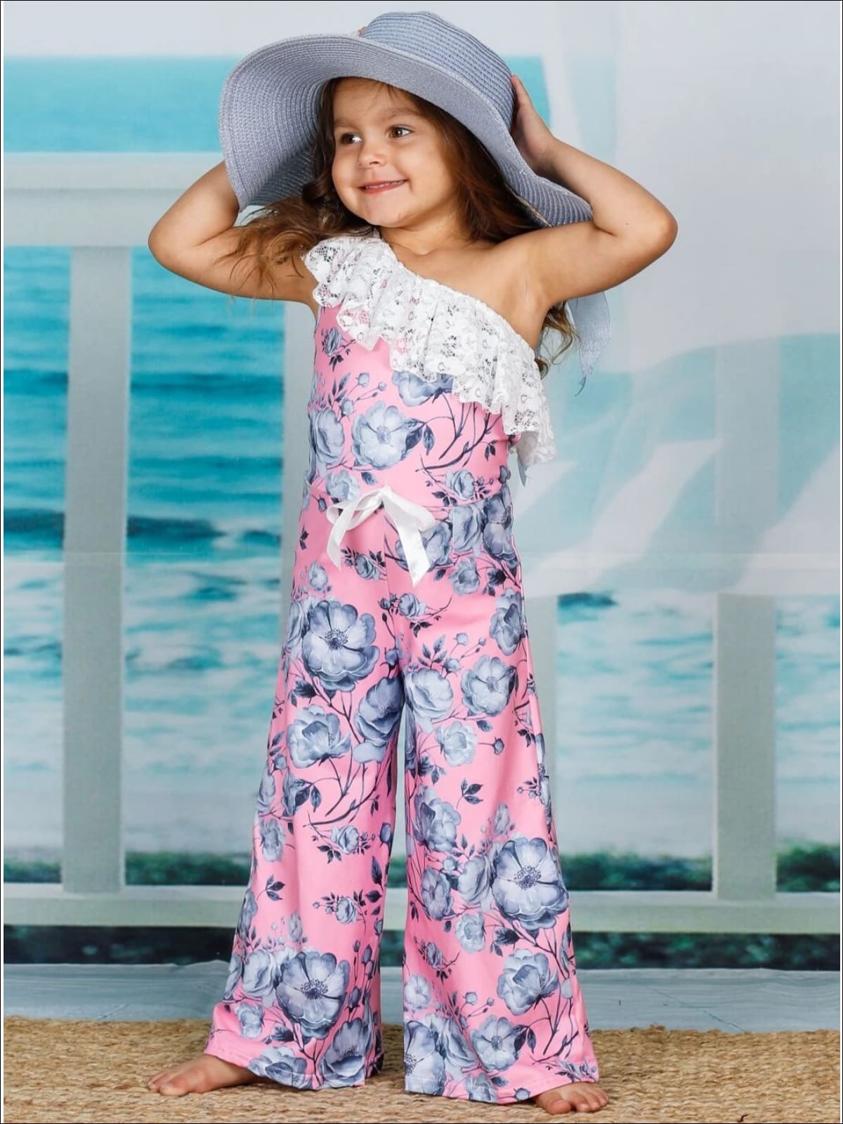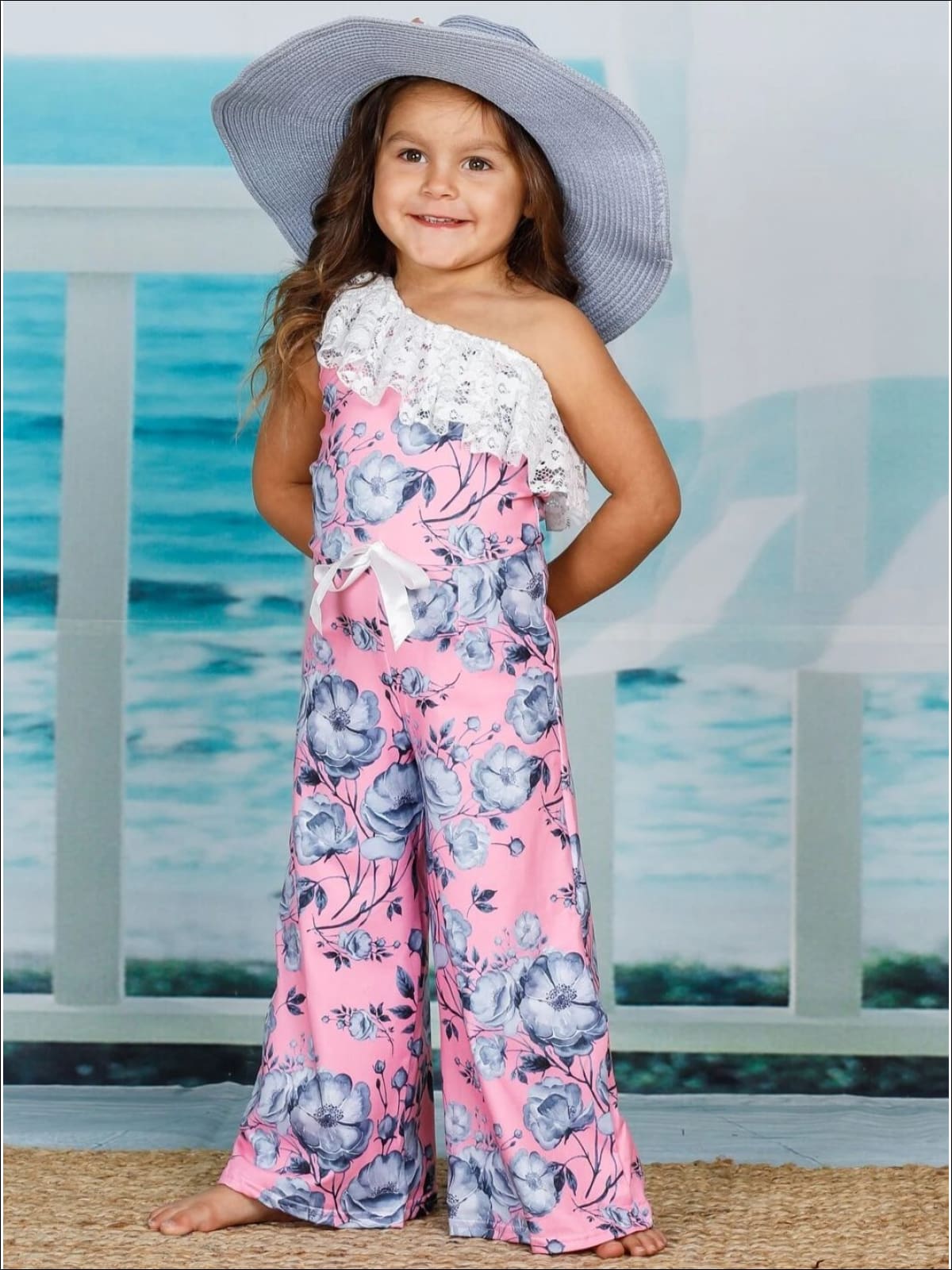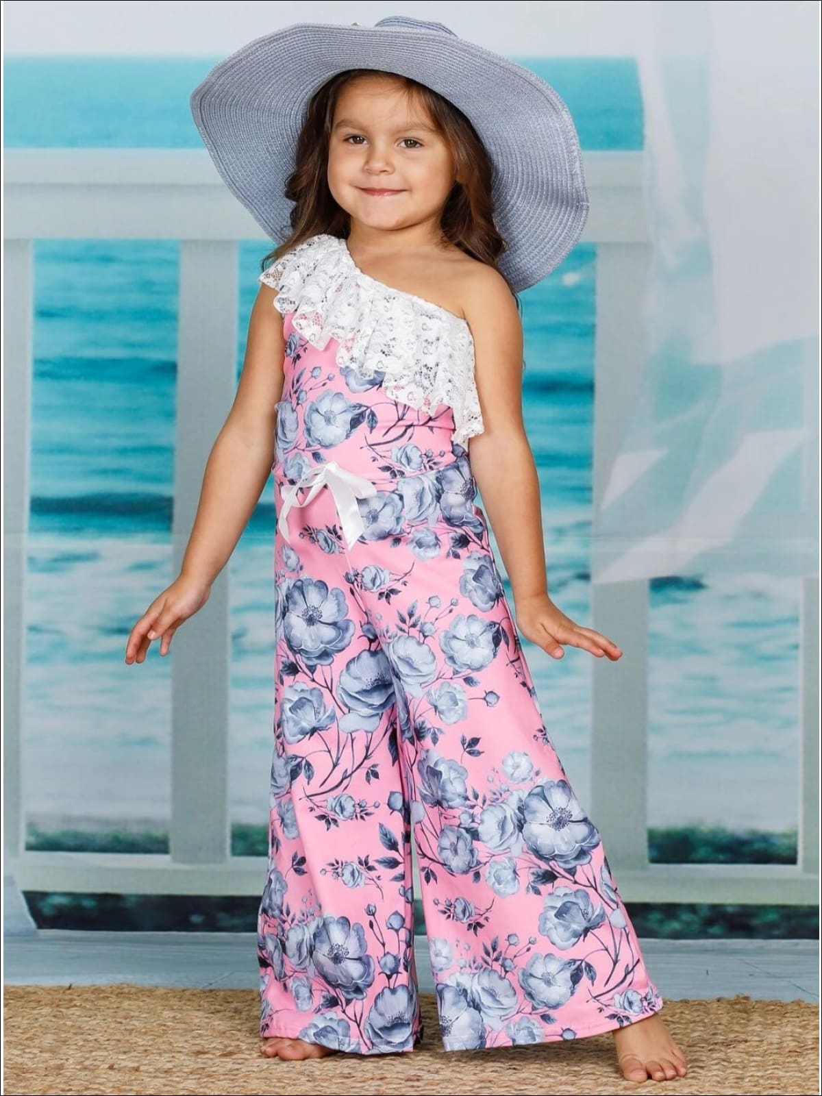 - Step up your kiddo's special occasion wardrobe with this contemporary jumpsuit flaunting a one-shoulder lace detail and lightweight fabric.