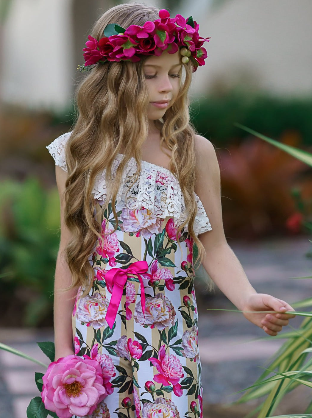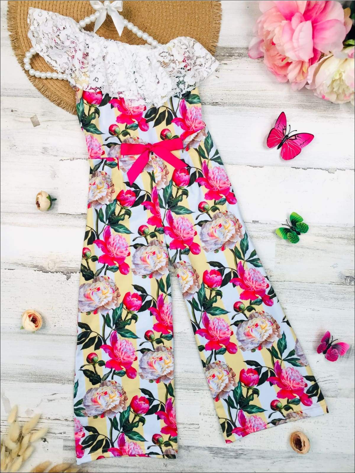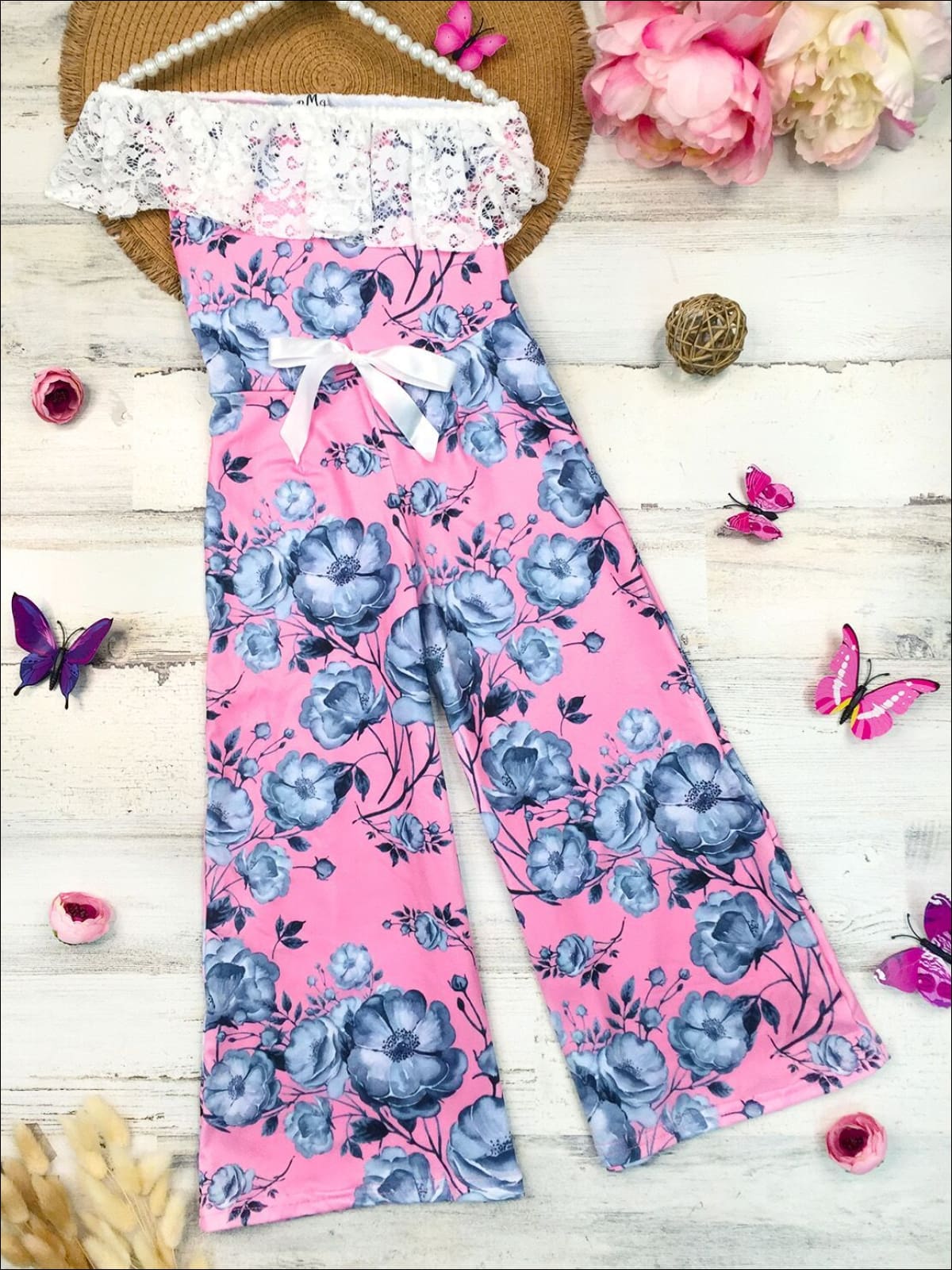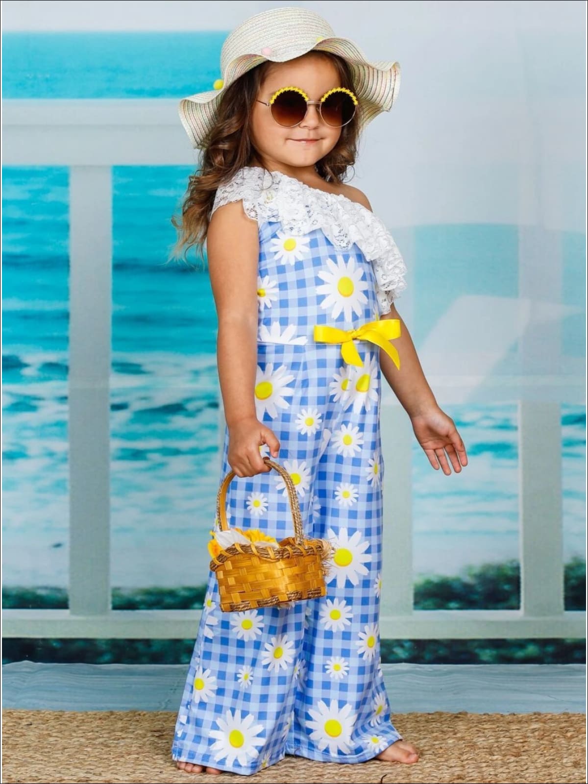 - Step up your kiddo's special occasion wardrobe with this contemporary jumpsuit flaunting a one-shoulder lace detail and lightweight fabric.