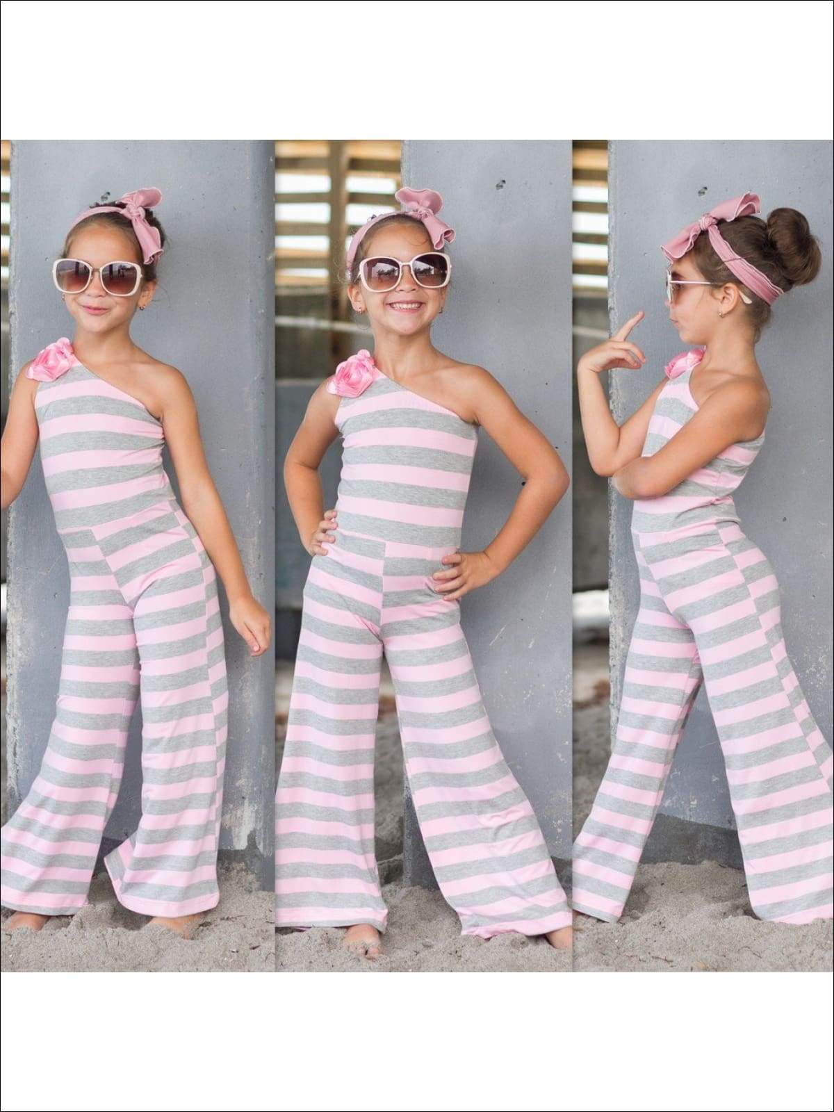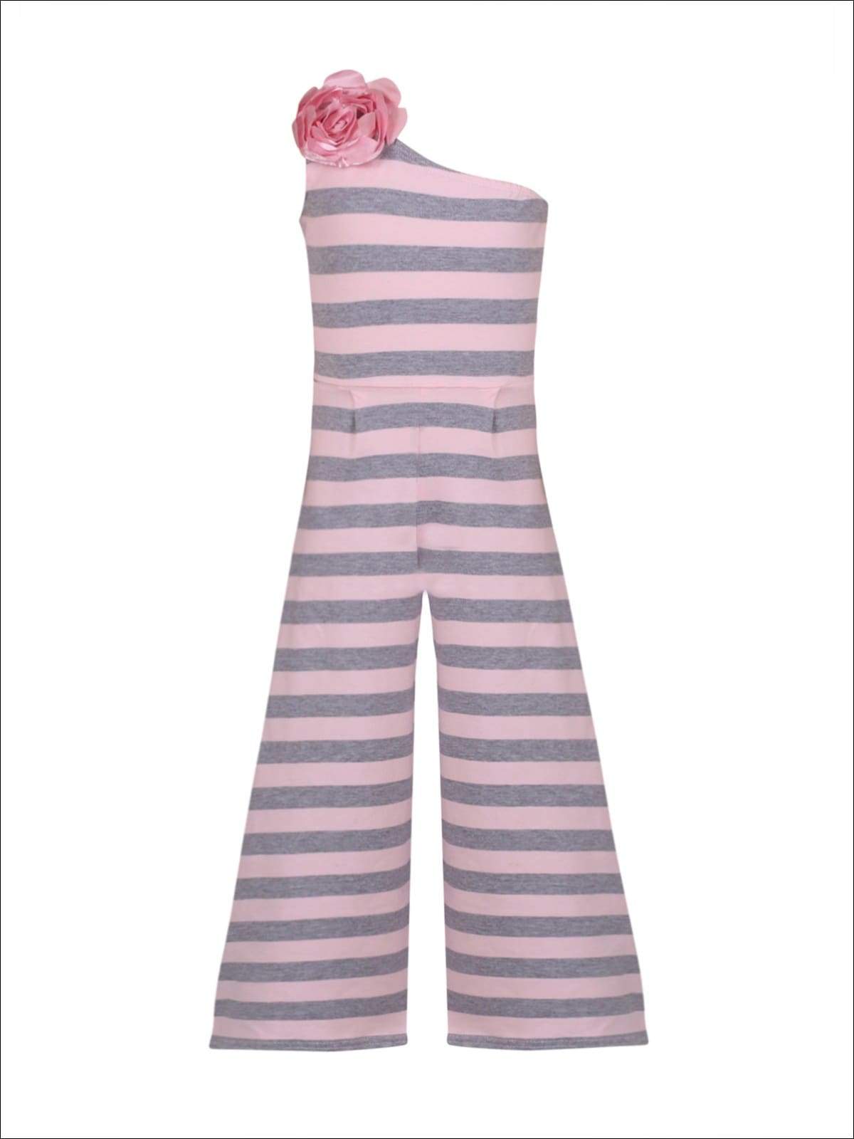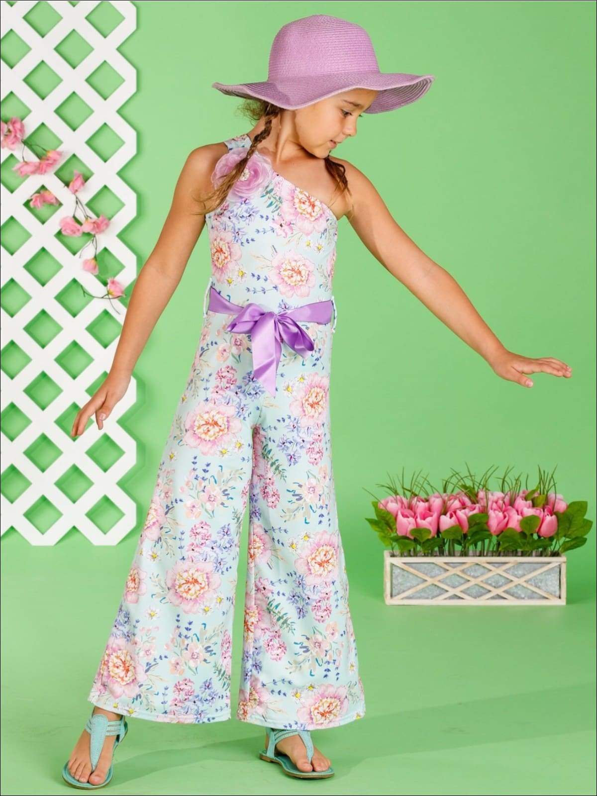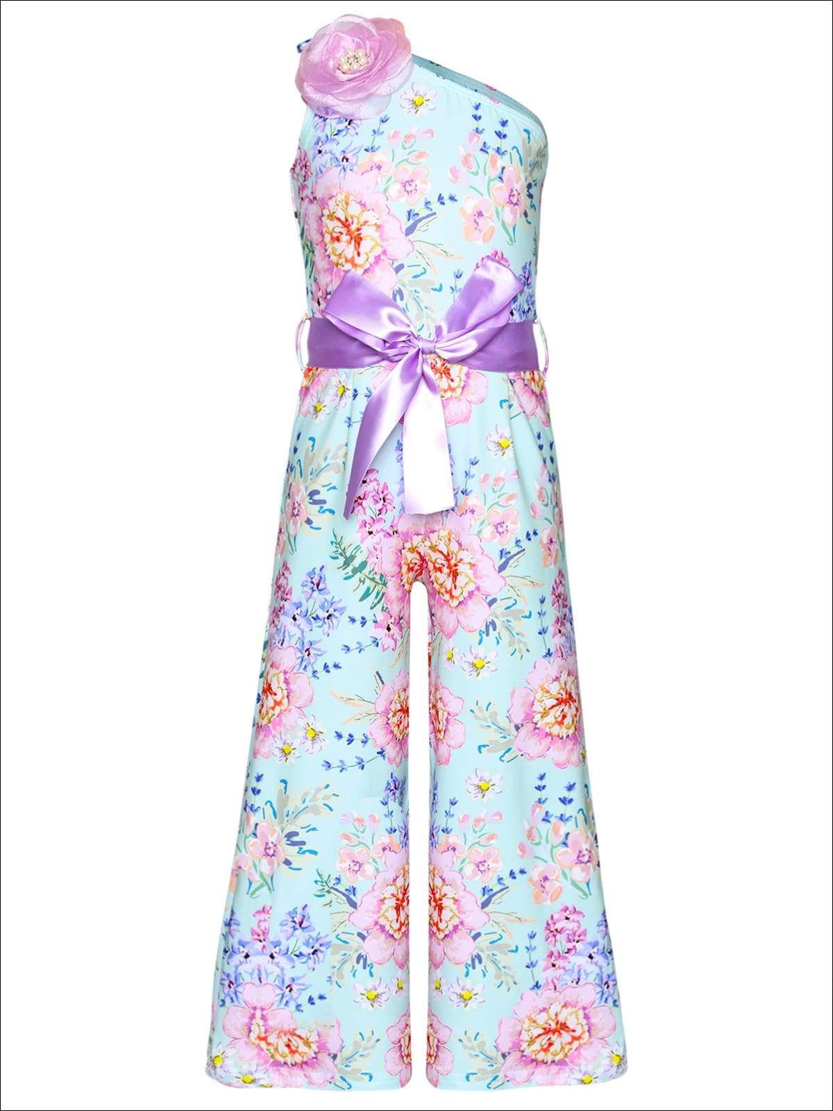 Girls One Shoulder Palazzo Jumpsuit with Flower Trim