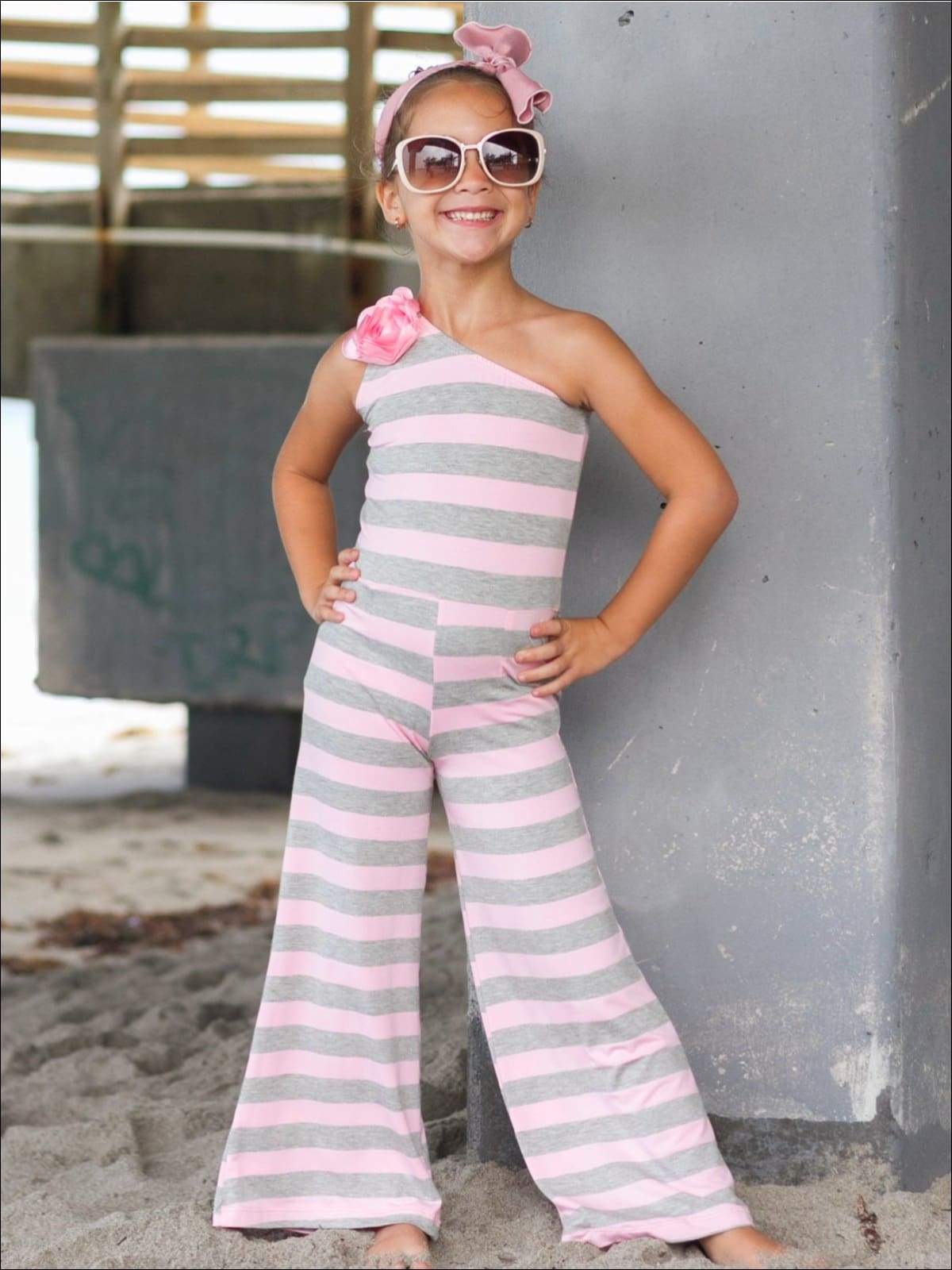 - Step up your kiddo's special occasion wardrobe with this contemporary one-shoulder jumpsuit flaunting a playful flower accent and lightweight fabric.