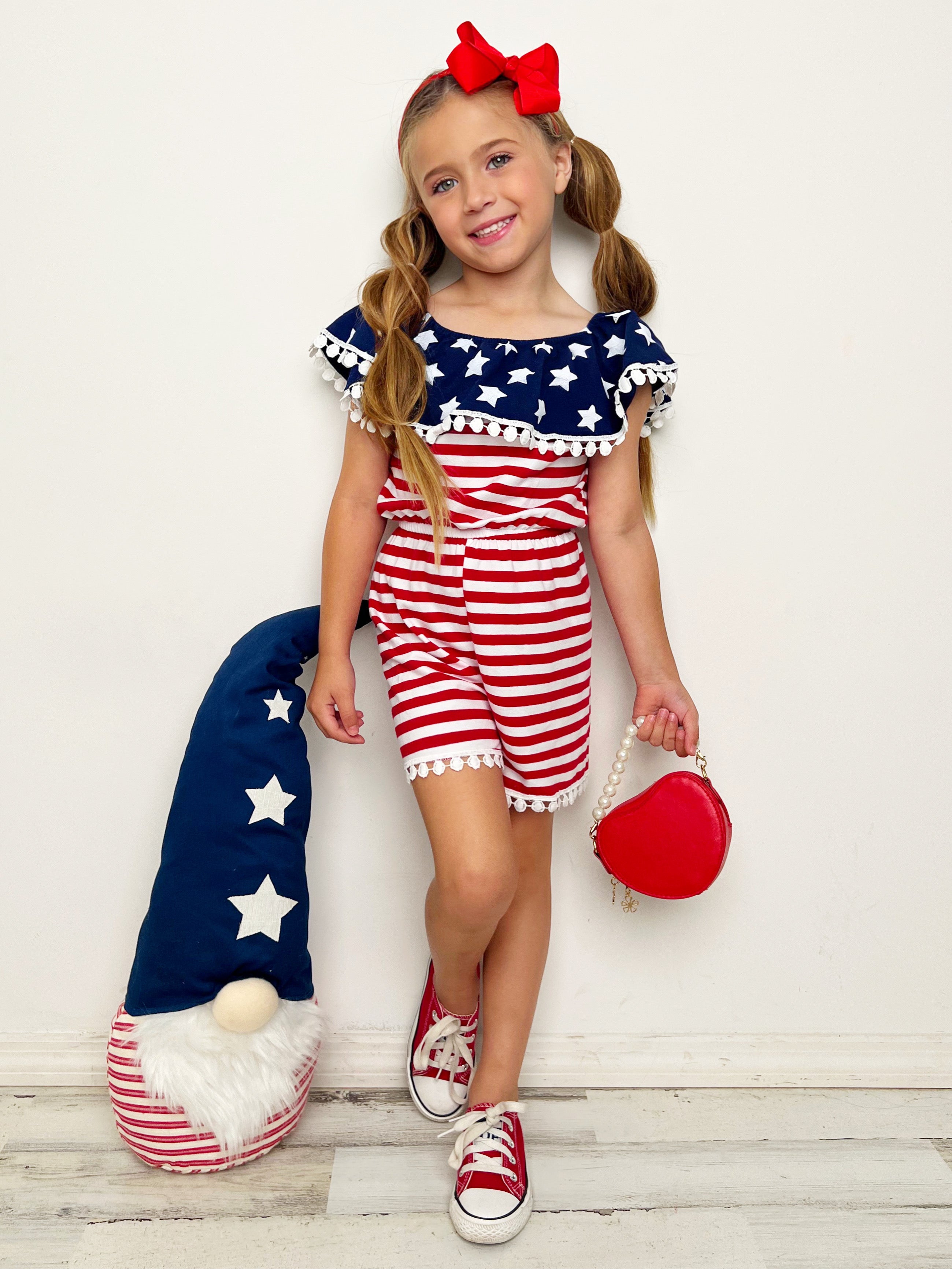 - Every little girl needs a 4th of July outfit that's effortlessly adorable! This patriotic pom-pom striped romper will have your mini fashion diva stepping out in style. Adorable pom-pom trim with festive stars and stripes will look stunning for summer warm-weather holiday events.