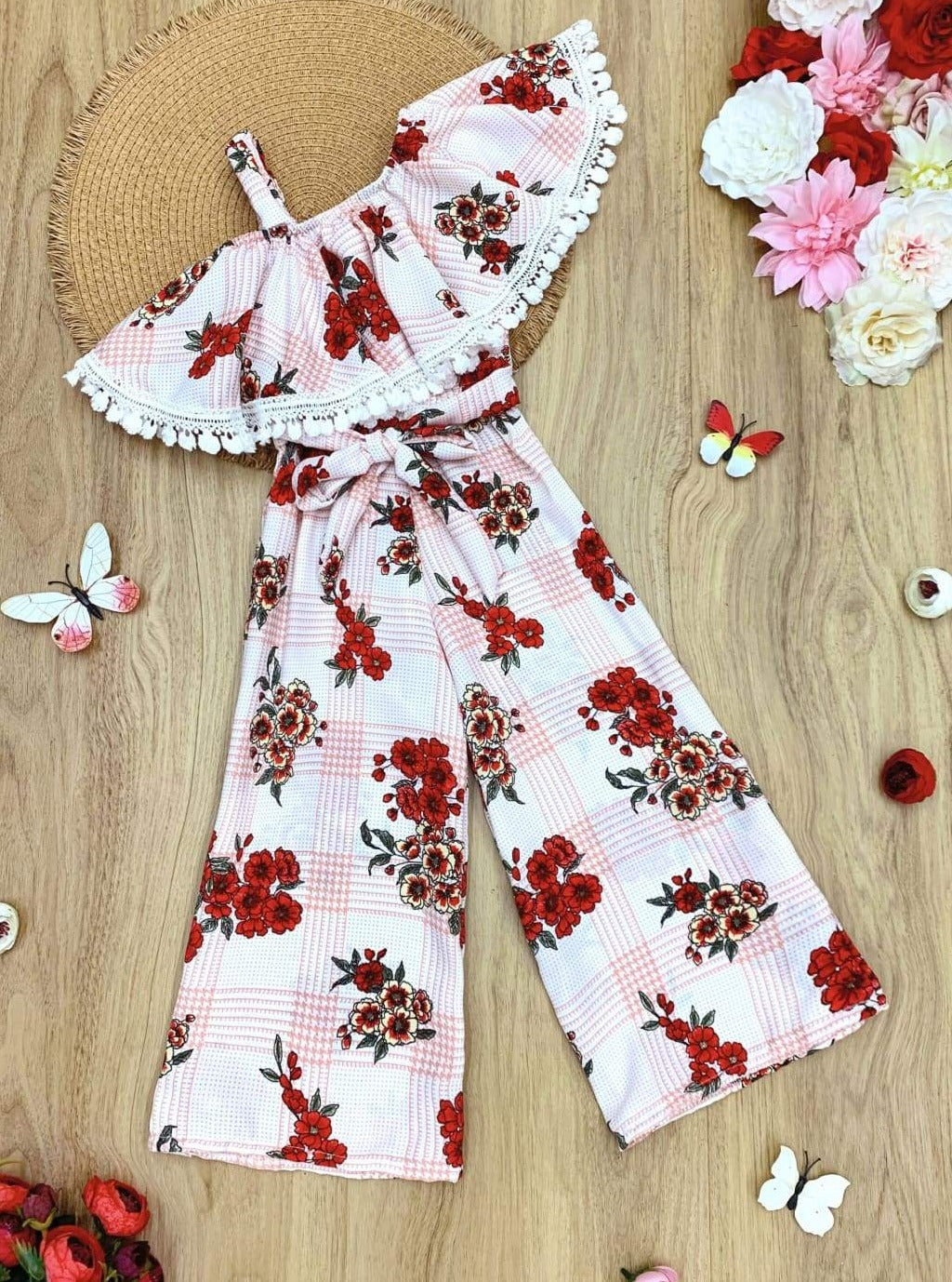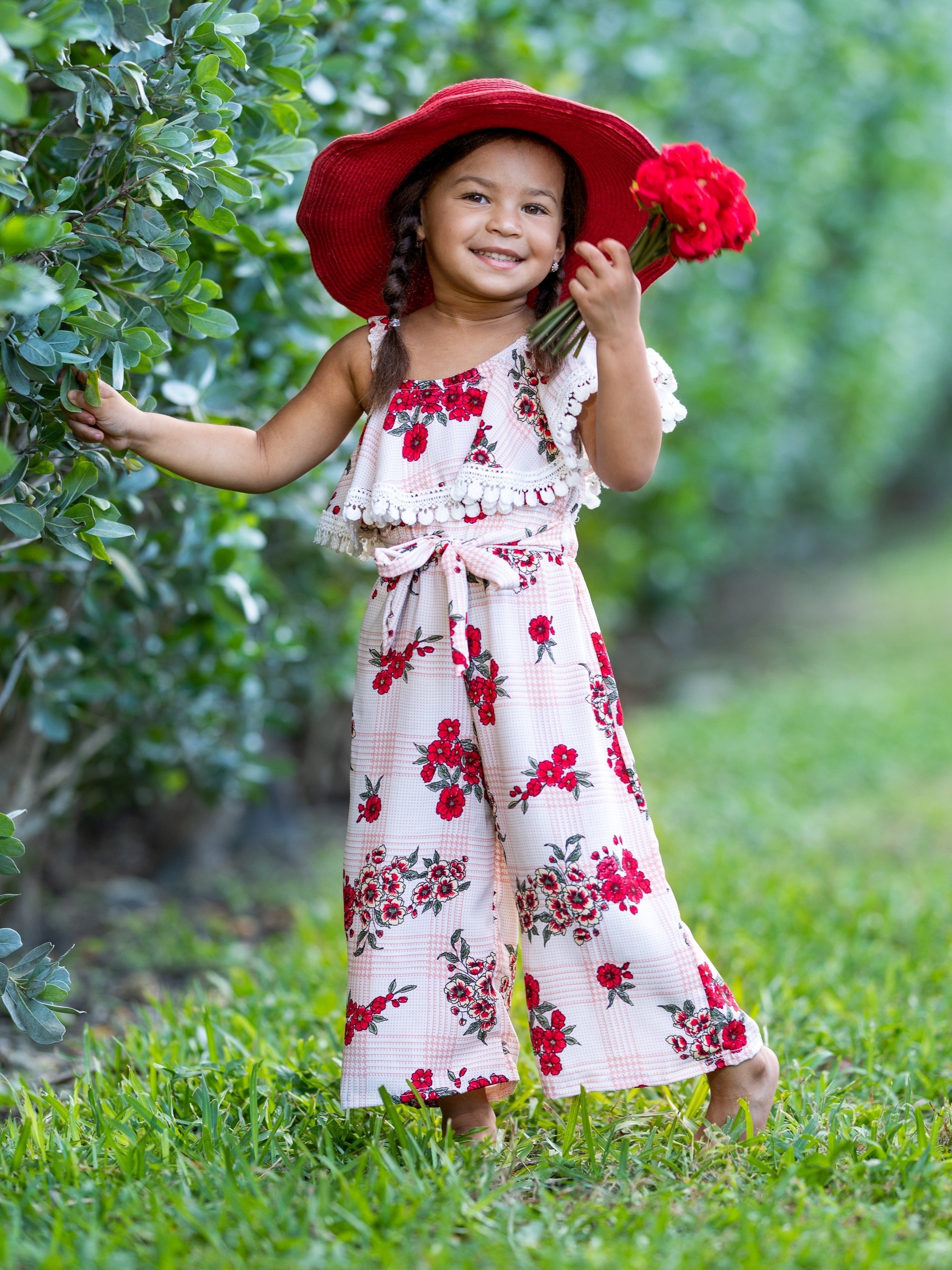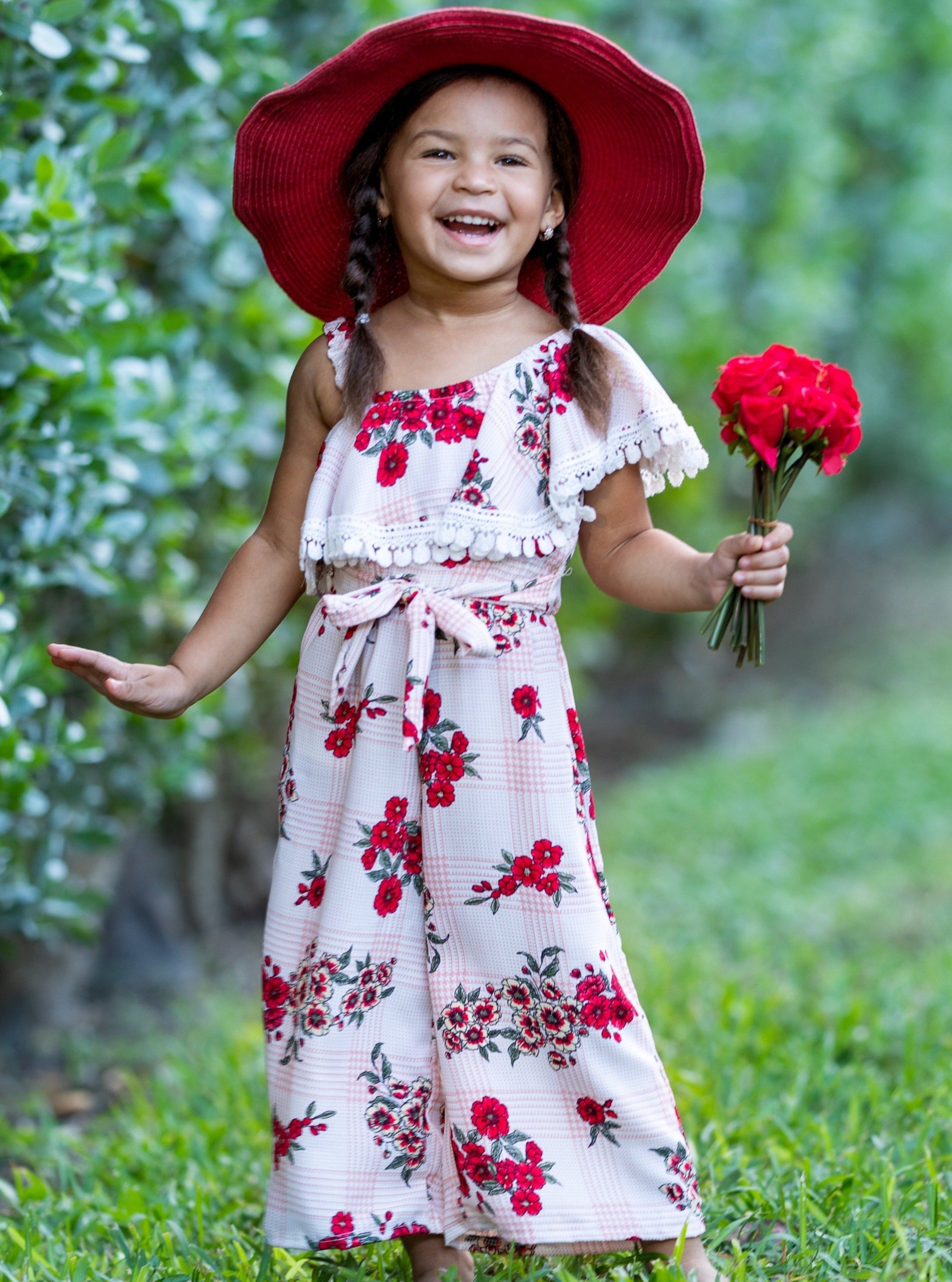- Send your little jet-setter off to parties and play dates in style with this cute-as-can-be jumpsuit that flaunts a floral or plaid print and cinched waist for chic appeal. The couture asymmetrical shoulders, built-in drawstring, and romantic silhouette are sure to be your girl's new Spring favorite.