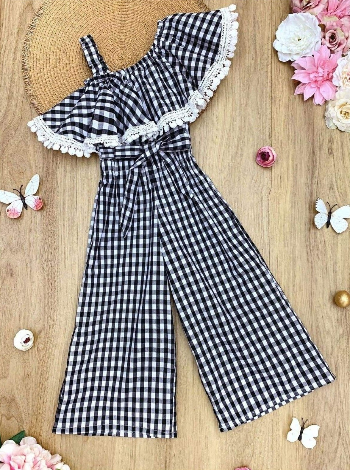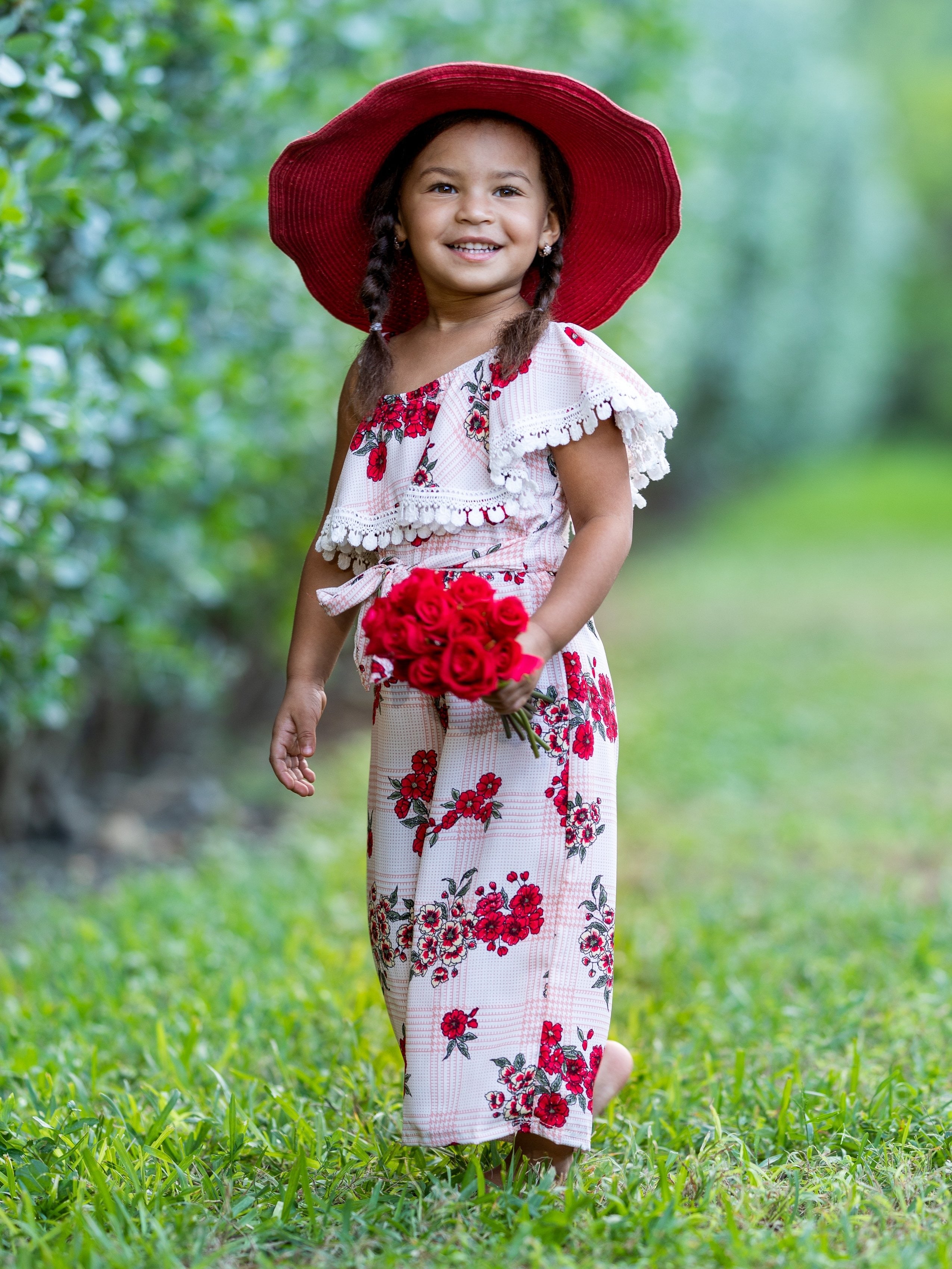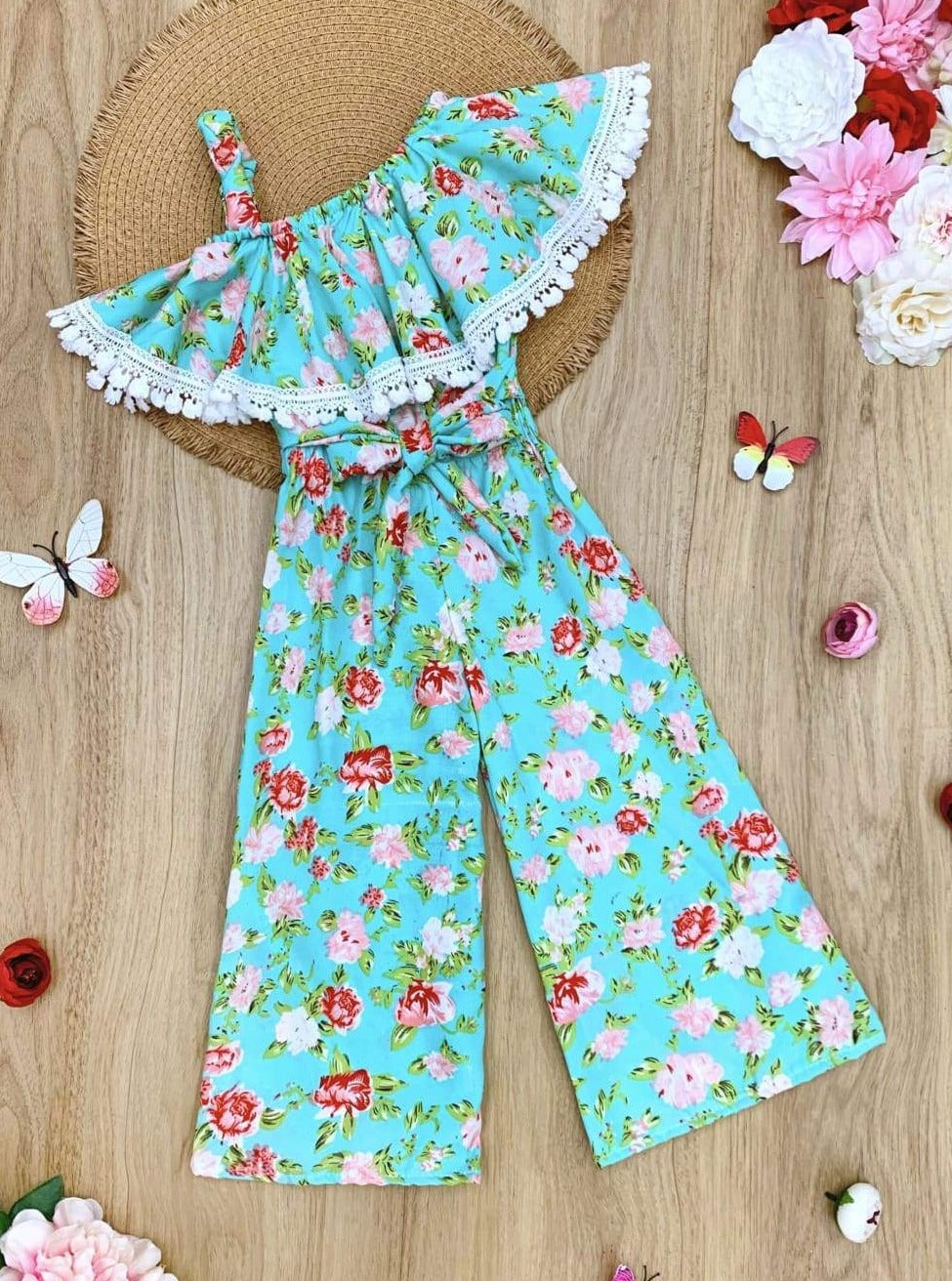 - Send your little jet-setter off to parties and play dates in style with this cute-as-can-be jumpsuit that flaunts a floral or plaid print and cinched waist for chic appeal. The couture asymmetrical shoulders, built-in drawstring, and romantic silhouette are sure to be your girl's new Spring favorite.