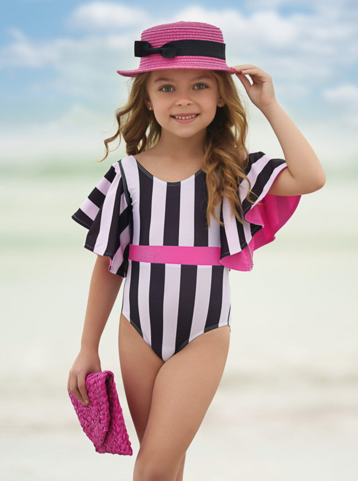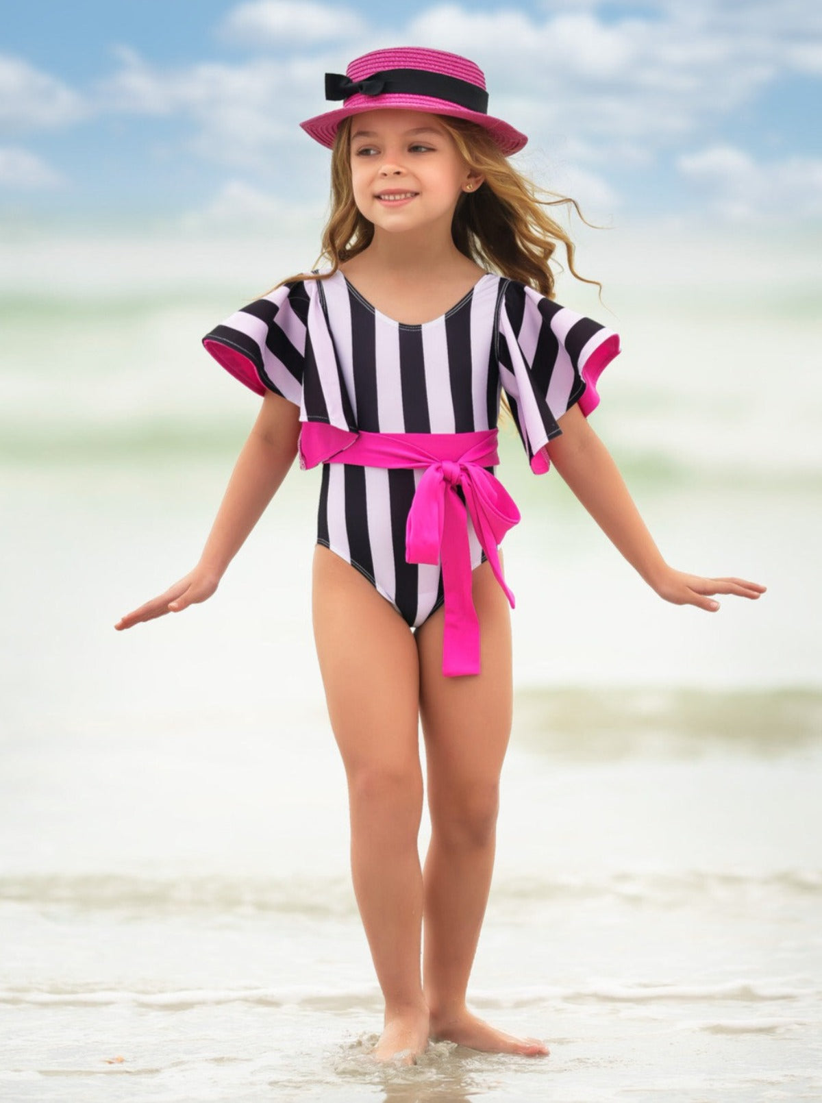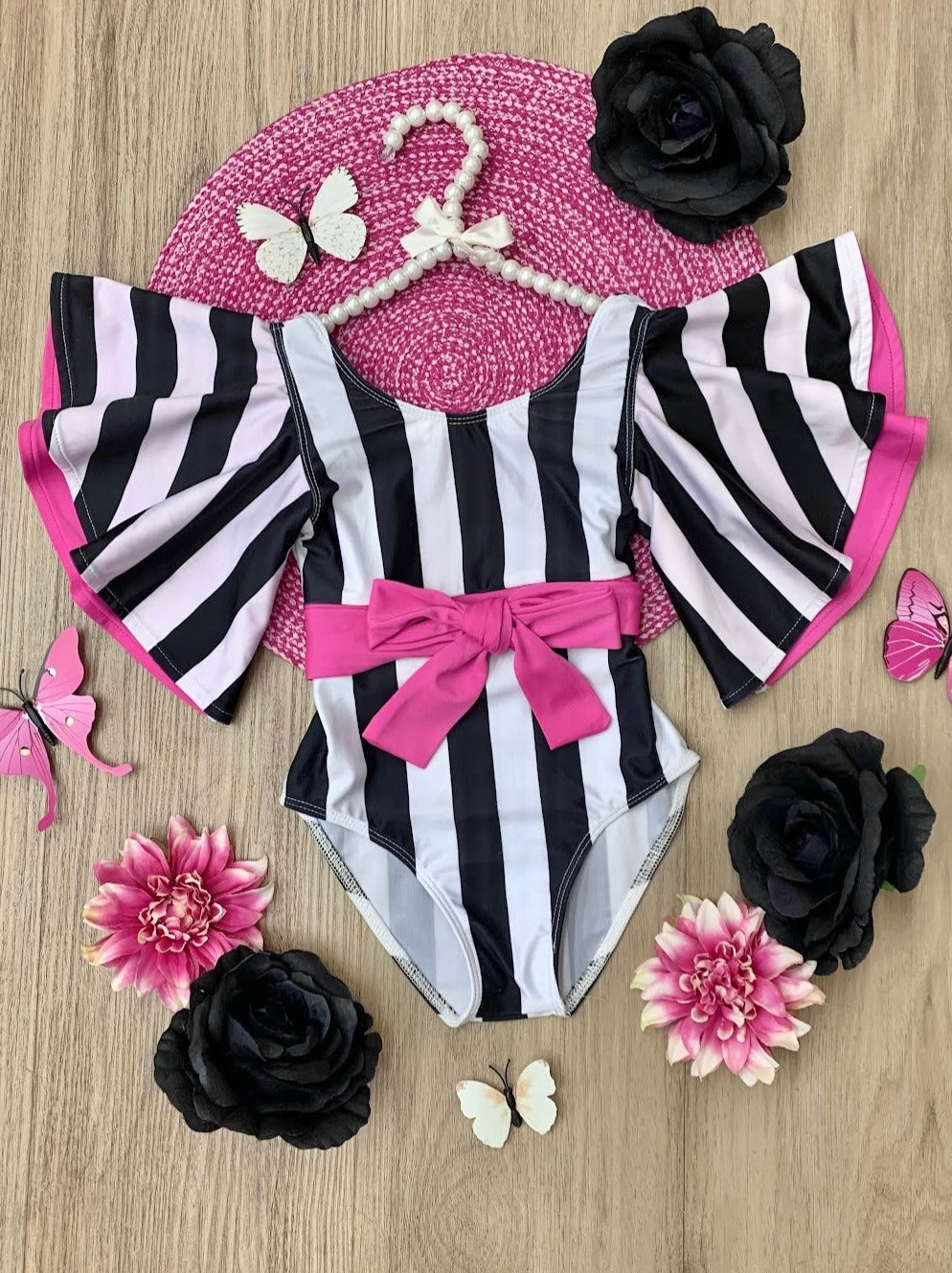 - Dressed to impress in swim-tastic attire thanks to our striped flare sleeve one-piece swimsuit. The pop of hot pink makes the black and white stripes and fancy sleeves stand out all the more. It's enough to make even mommy a little jealous!