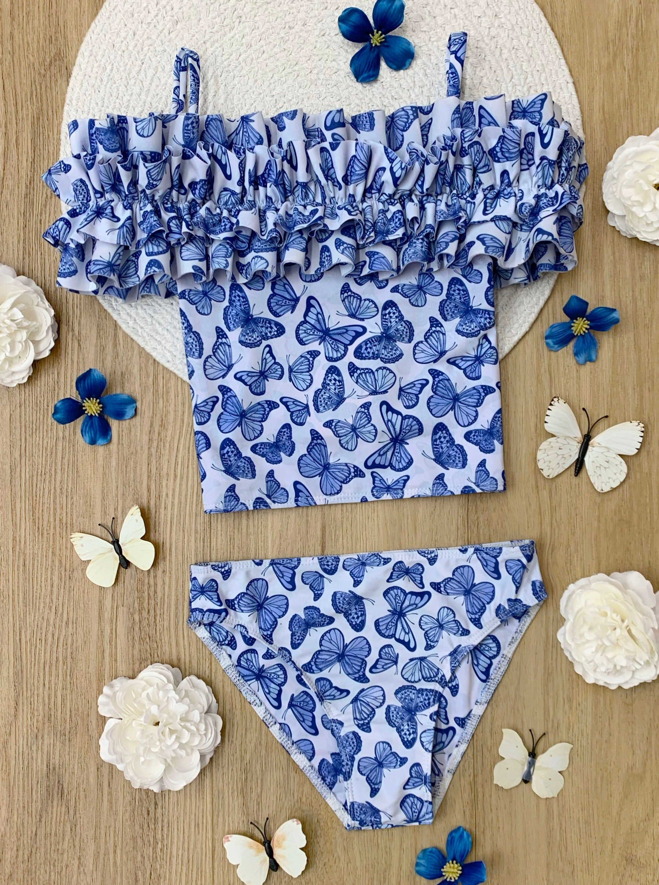 - Let's make your precious girl's summer adventures more stylish, shall we? Our butterfly print ruffle tankini two-piece swimsuit adds a charming touch to her beach looks. A lovely pattern made even better with tiered ruffle details for a flattering and fluttering finish!