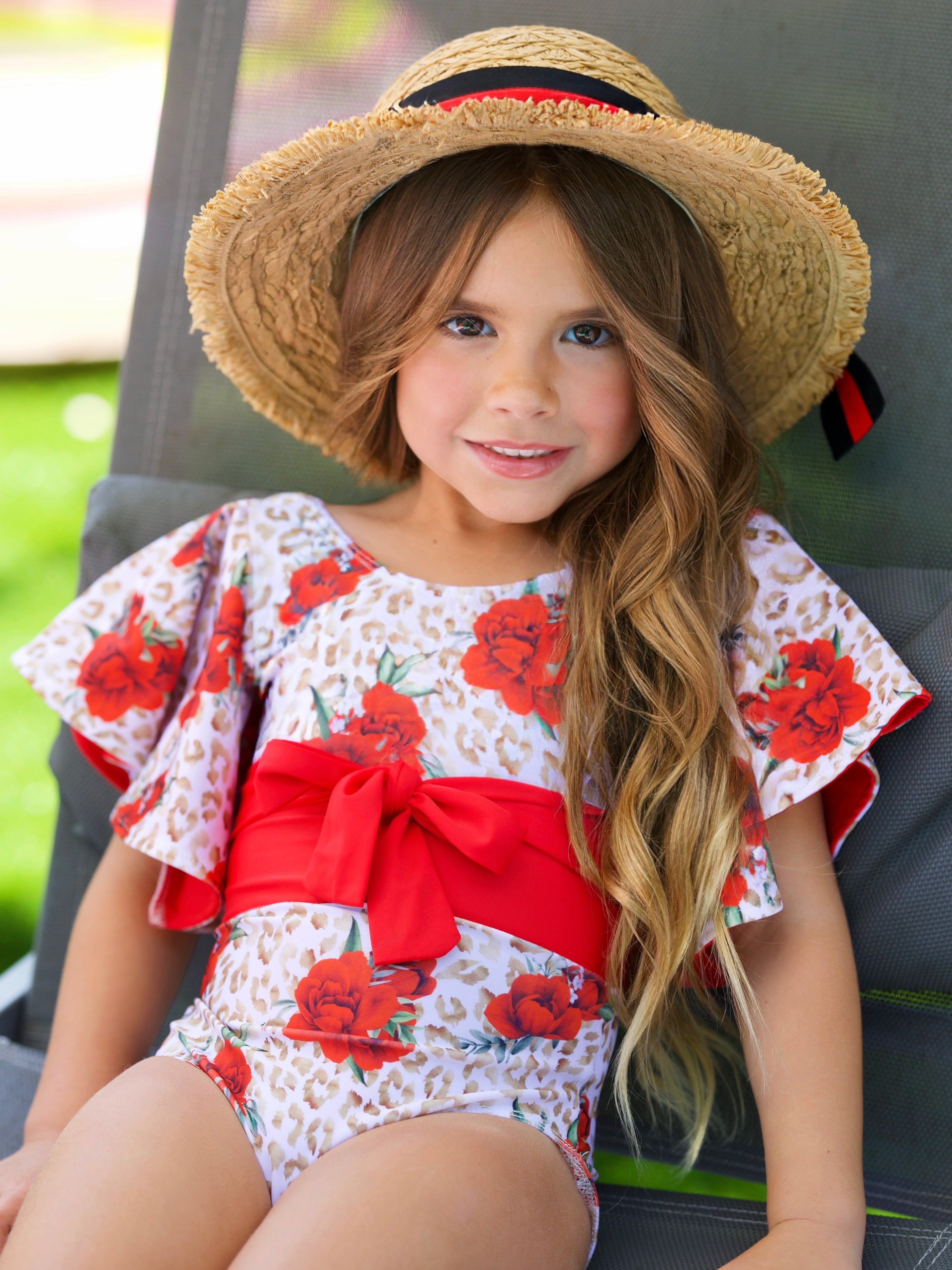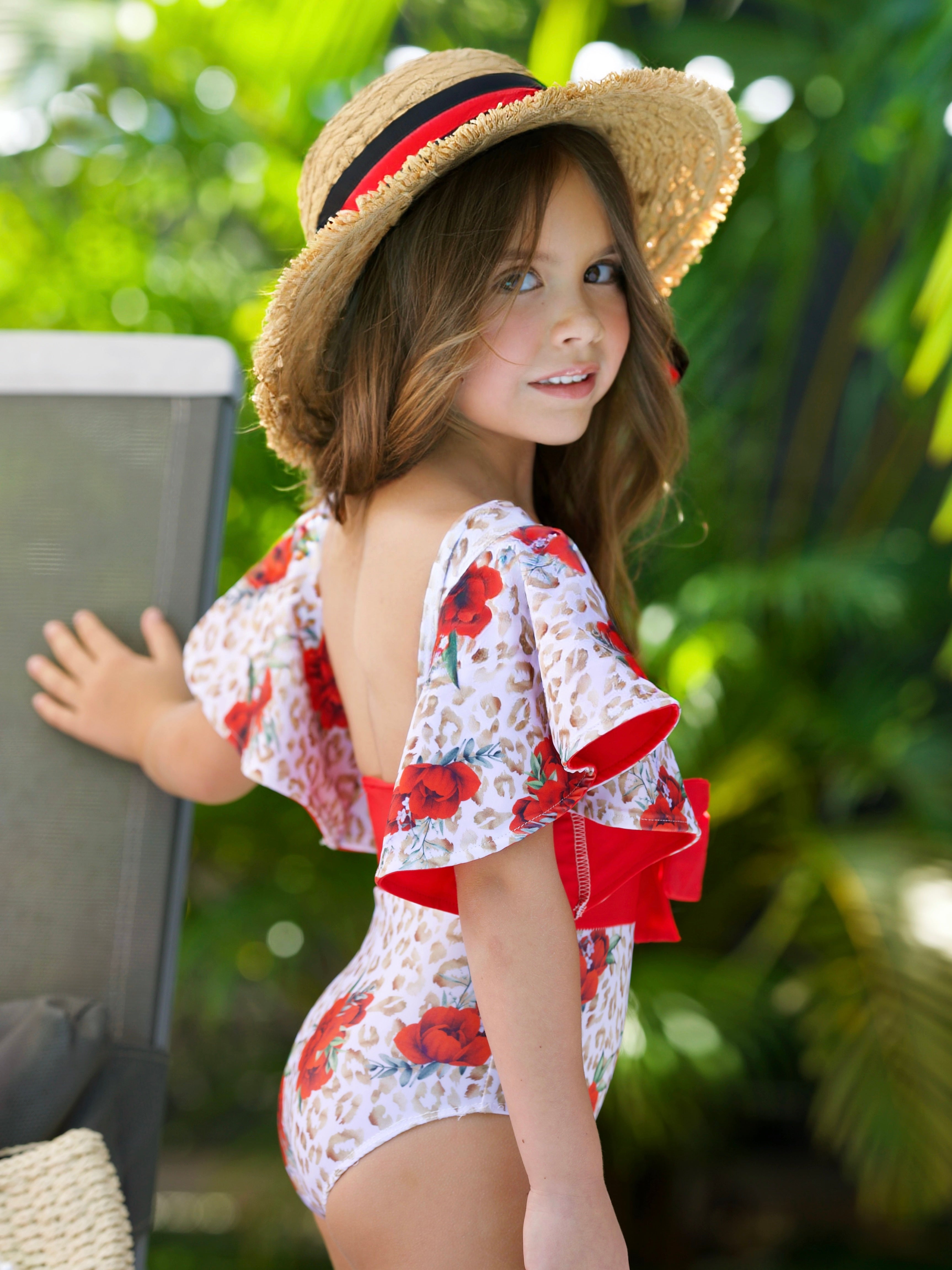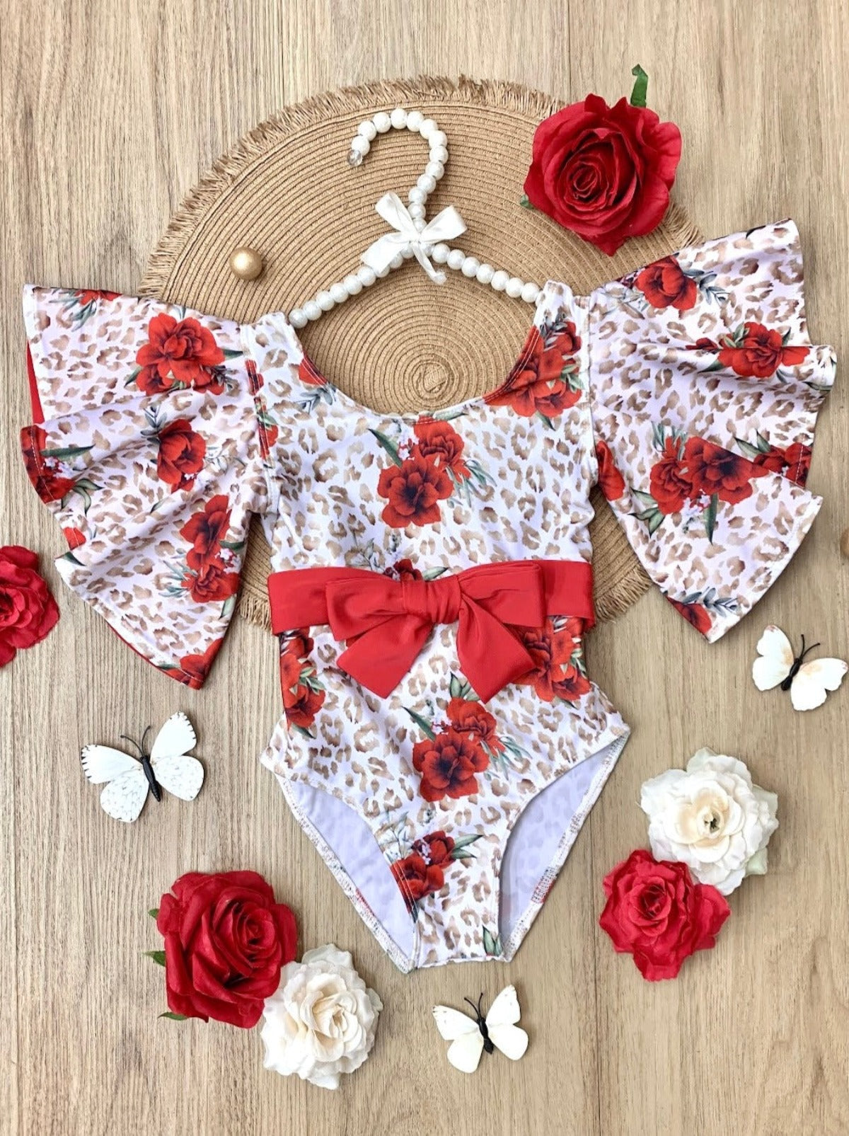 - Let's put a new spin on swim with our uniquely print flare sleeve one-piece swimsuit. Vibrant red roses with match the liner and statement bow at the waist that looks stunning paired with the faint leopard print. It's almost too cute to just be swimwear