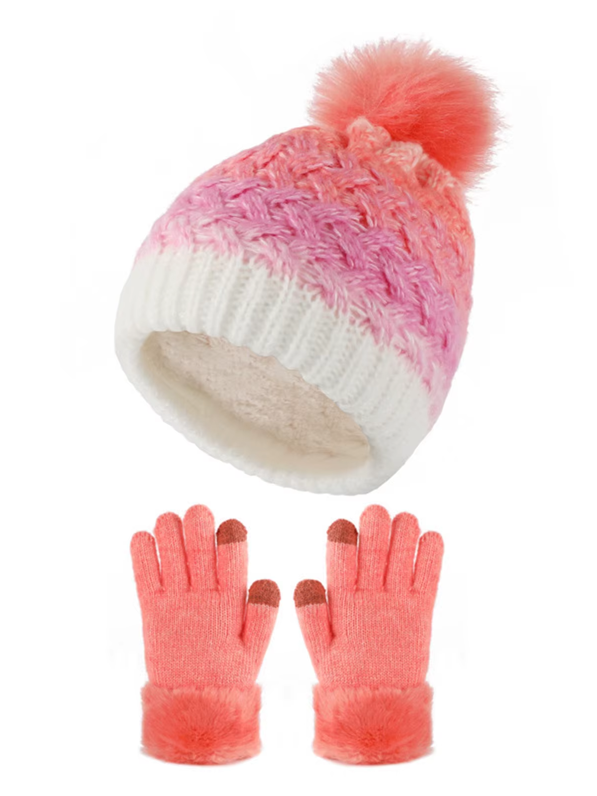 Keep your little one warm and stylish all winter long with this adorable pom-topped knit hat and matching gloves set, complete with a soft gaiter for extra coziness.