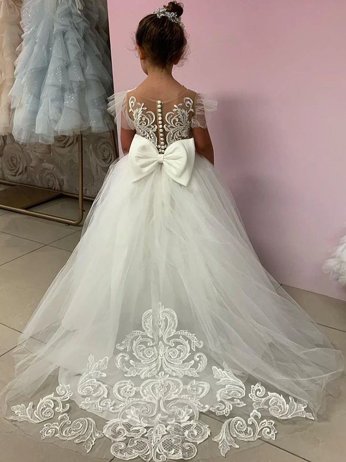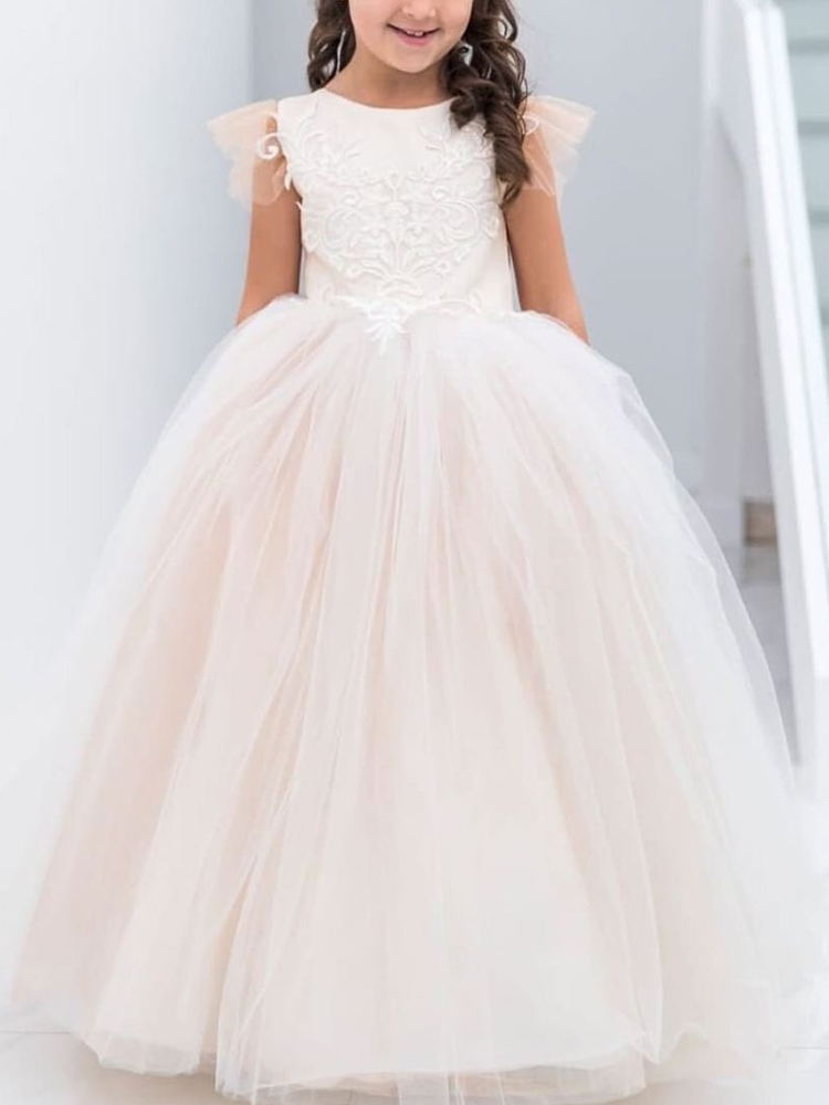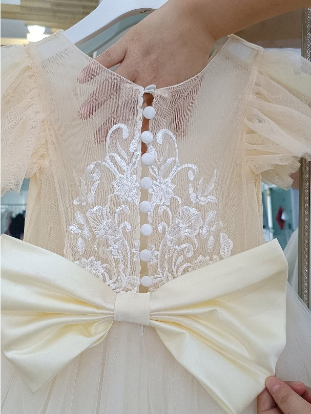 - This elegant gown is what dreams are made of. It has short sleeves and a fully embroidered bodice that is simply gorgeous! It has layers of tulle for a fuller skirt. It's perfect for any special occasion. Wear it for weddings, birthday galas, father-daughter dances, or any event you want her to dazzle. For a more voluminous skirt wear a petticoat underneath.