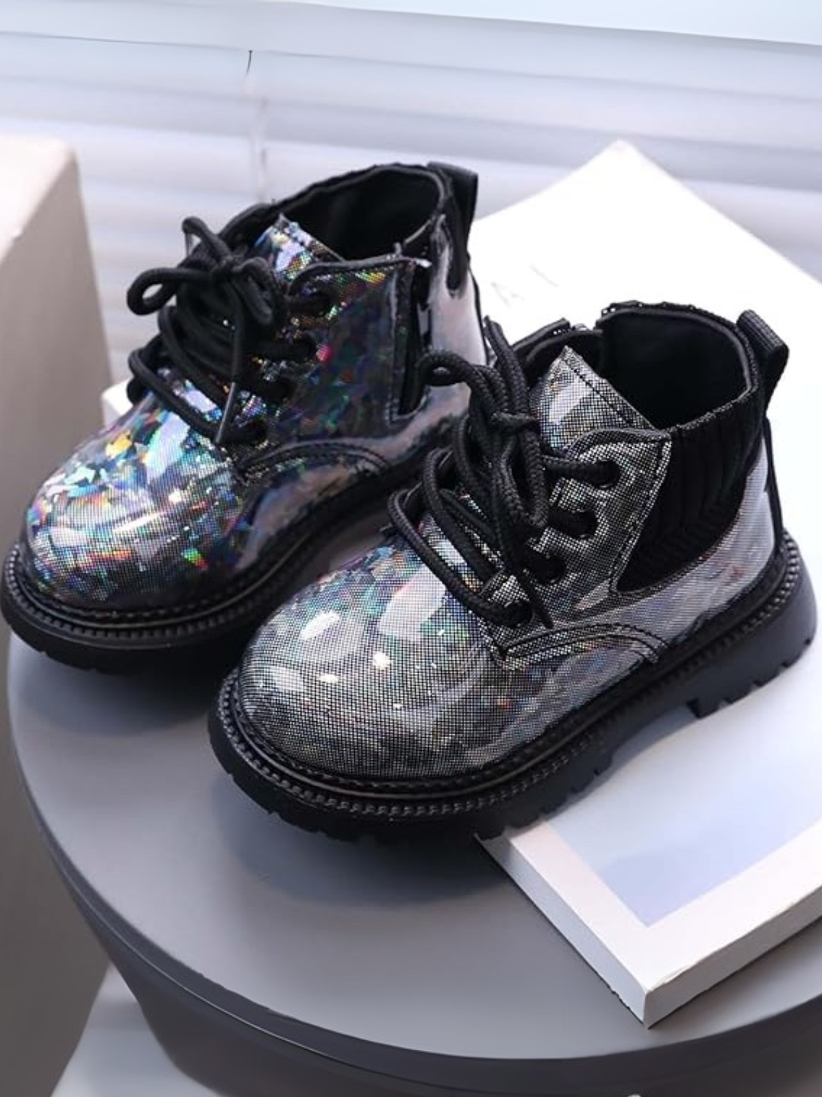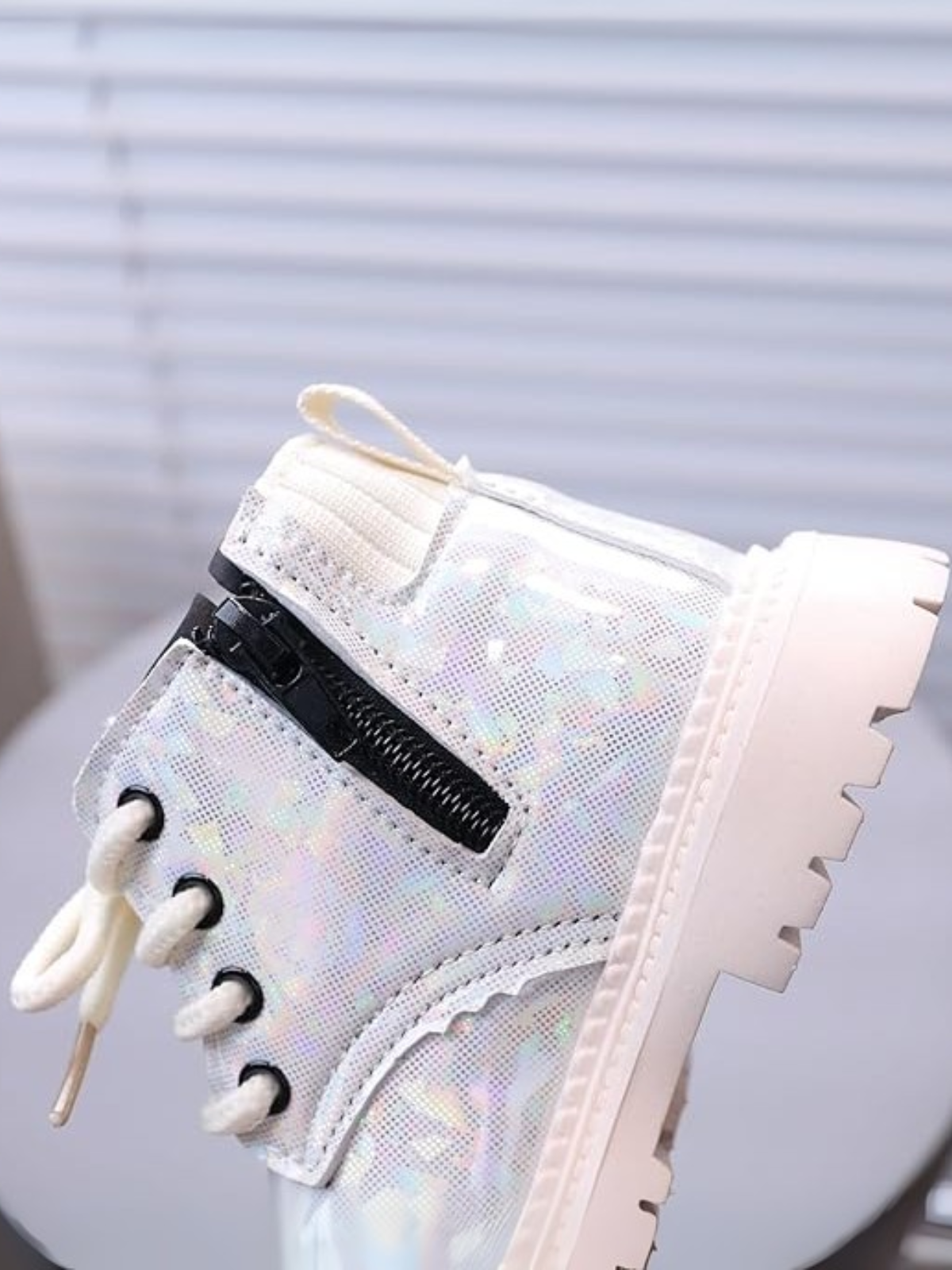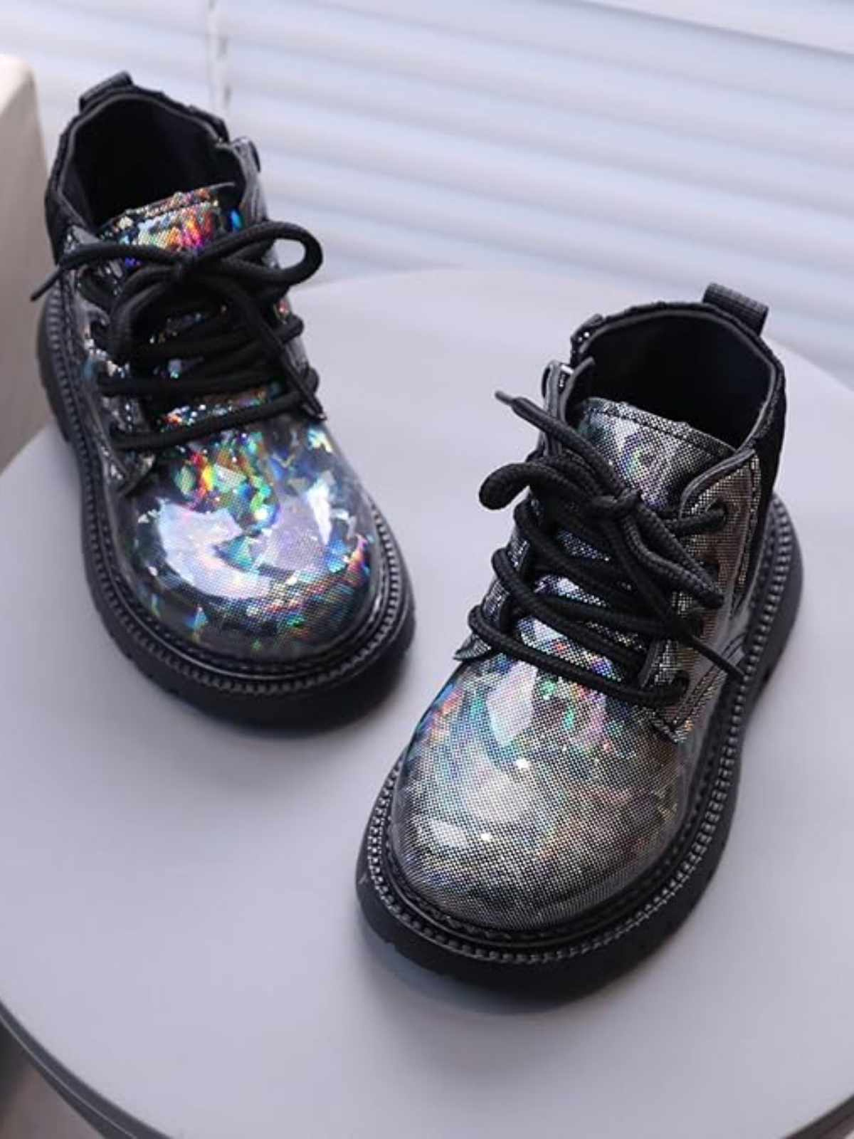 Brighten up every step with these dazzling holographic combat boots that blend attitude, sparkle, and comfort for everyday wear. Available in three striking colors—white, pink, and black—each pair shines with a magical iridescent finish that catches the light and her imagination.