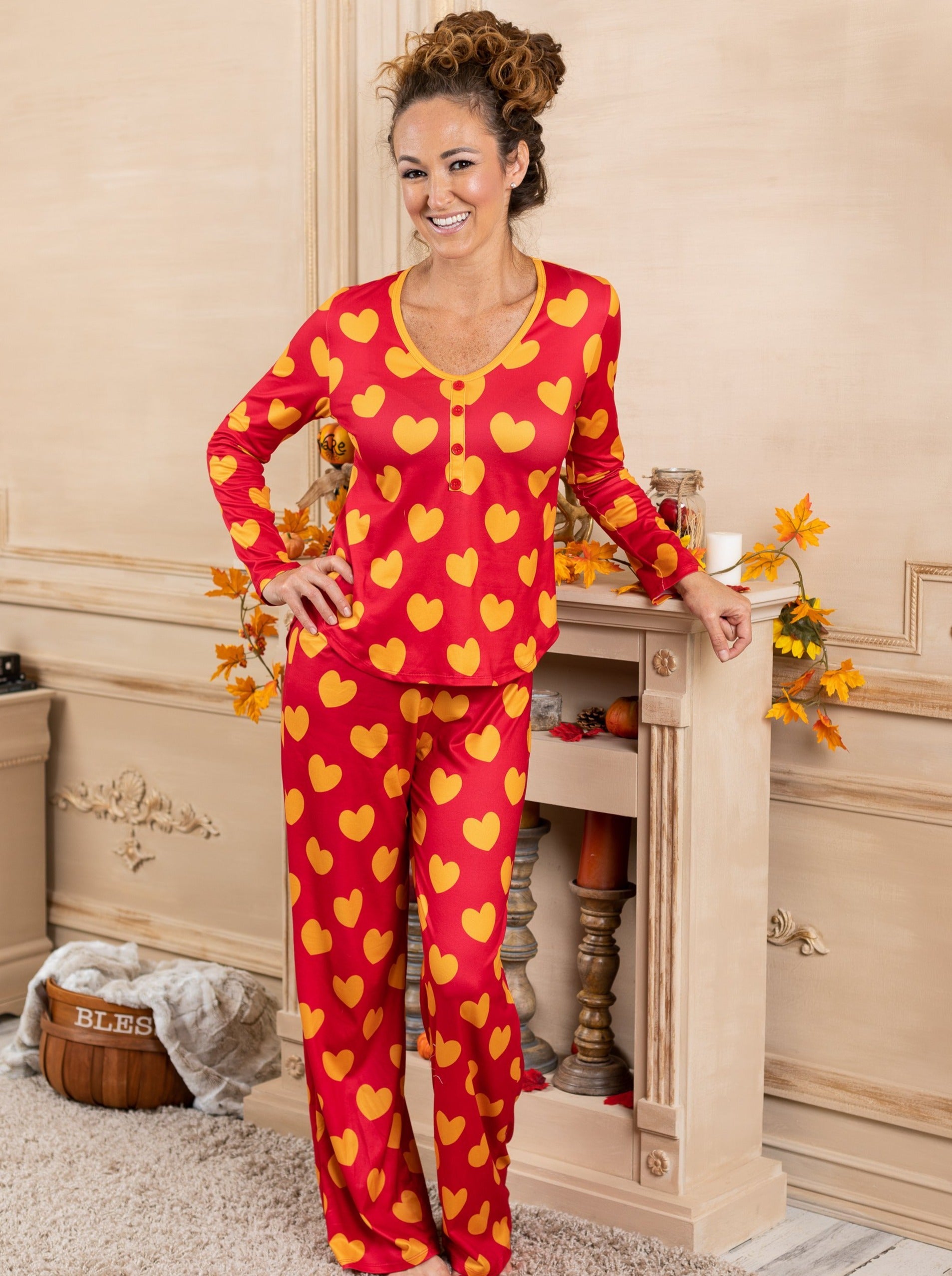 - Long-sleeve heart print pajama top with faux buttons and matching pajama pants
