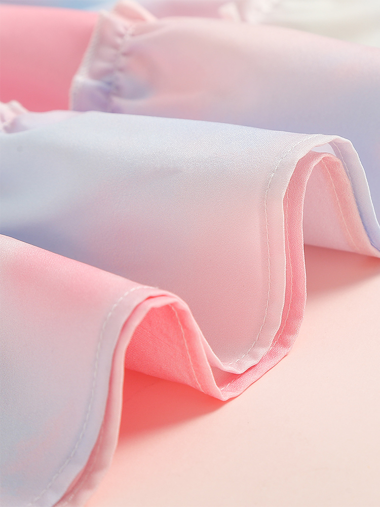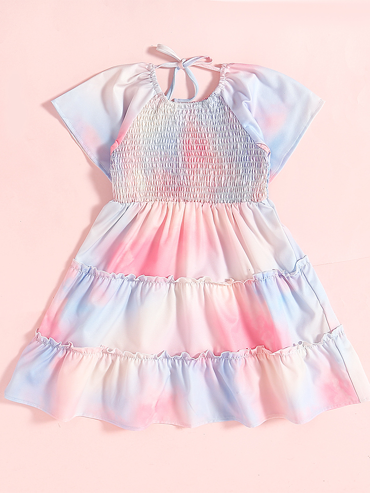 - Flutter-sleeve pastel tye-dye ruffle dress with fitted smock bodice, adjustable tie in back, and elastic waistband