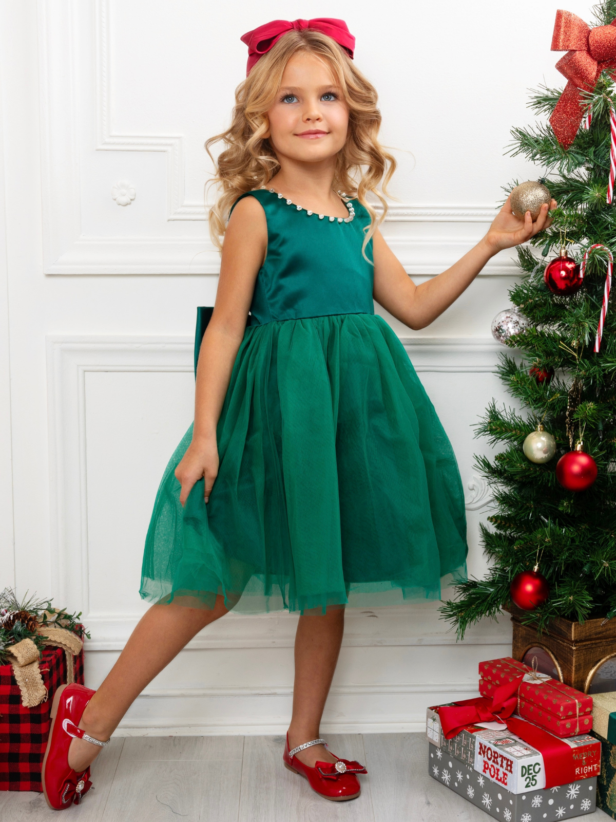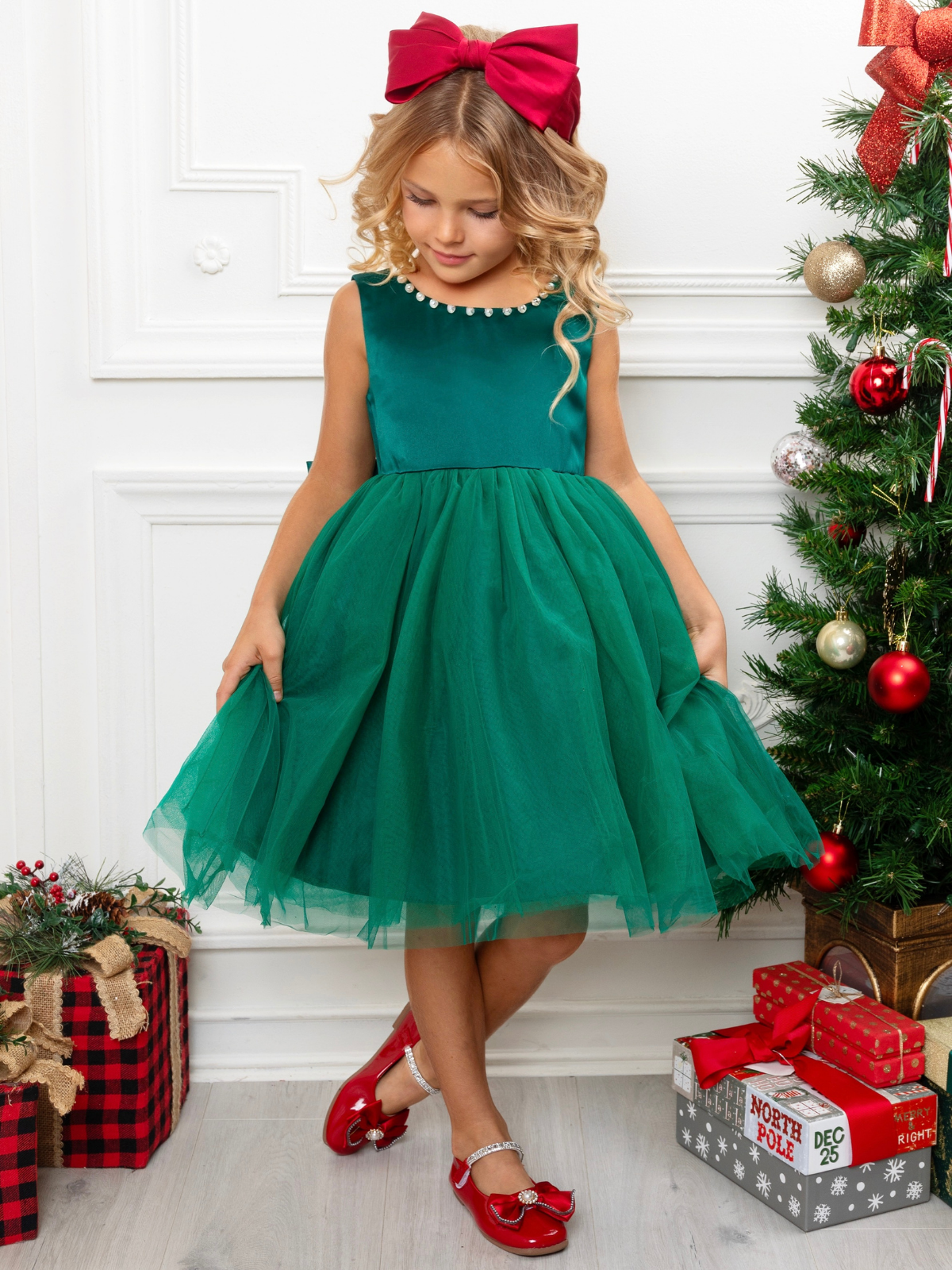 Perfectly Pine Green Bow Satin Christmas Dress