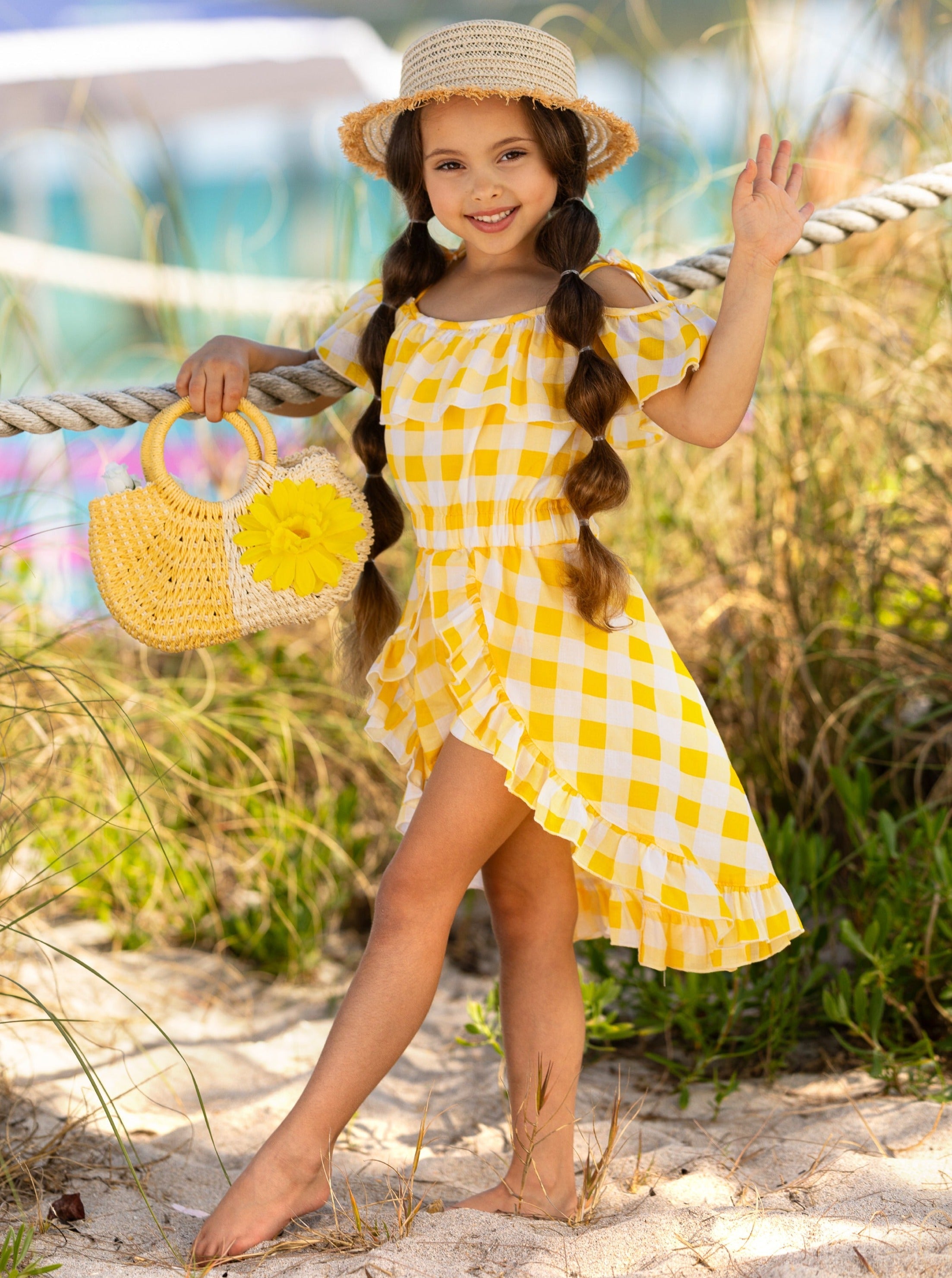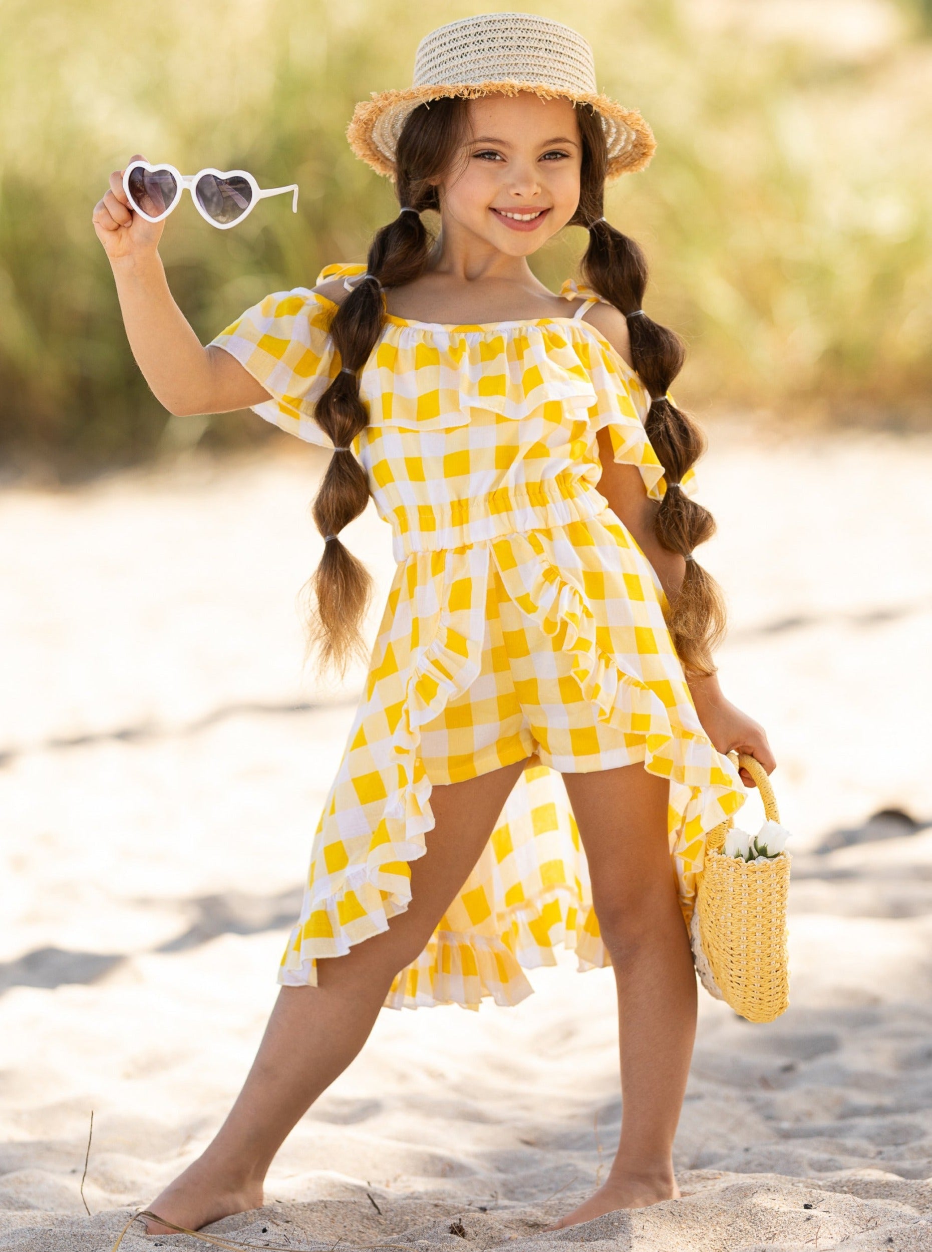 - When your little sunshine wants "play" in the front and "twirl" in the back, look no further than this all-in-one plaid romper dress. Vivid yellow picnic plaid on breathable, flowy fabric that makes it a warm-weather fashion staple. It's sure to get plenty of compliments on playdates and family outings.